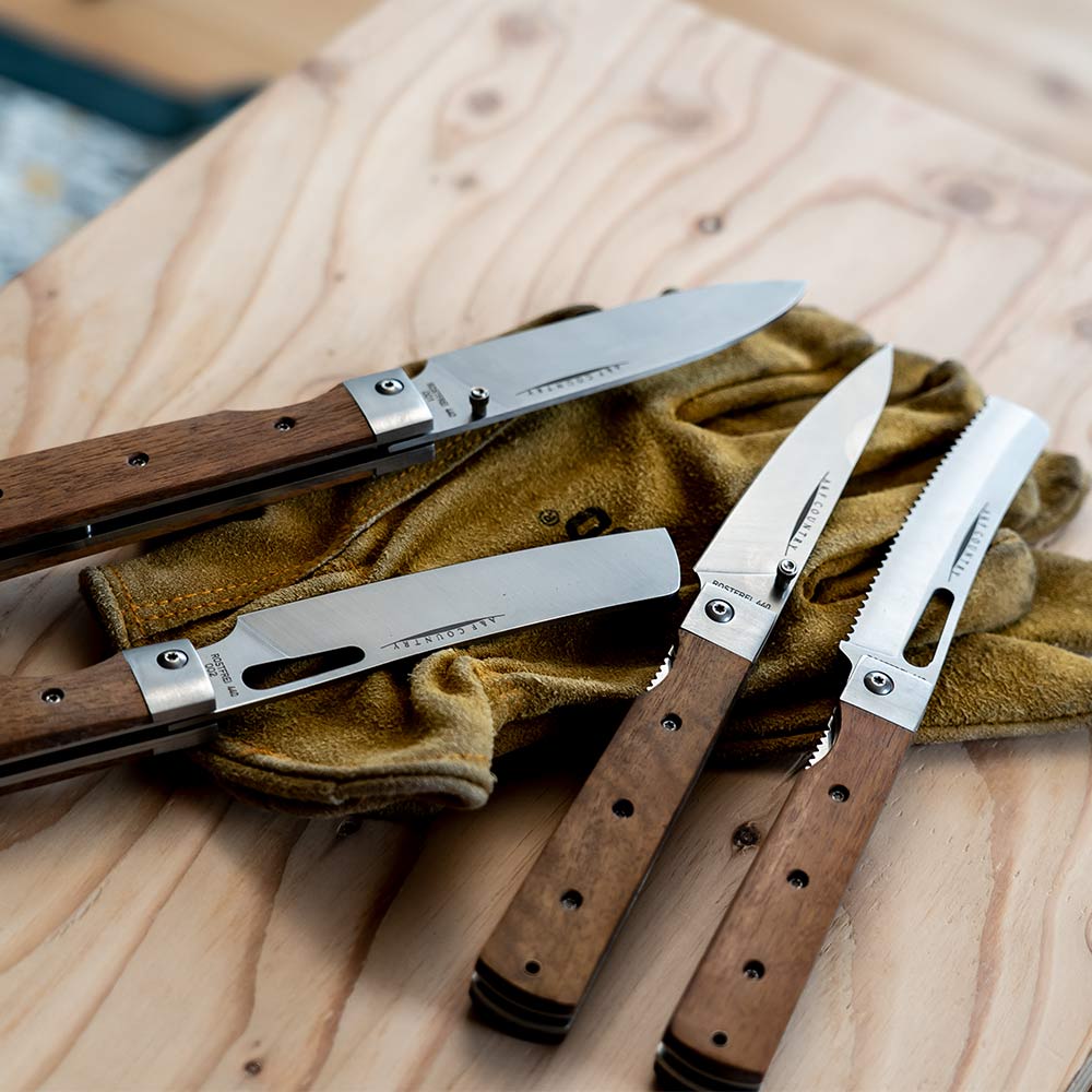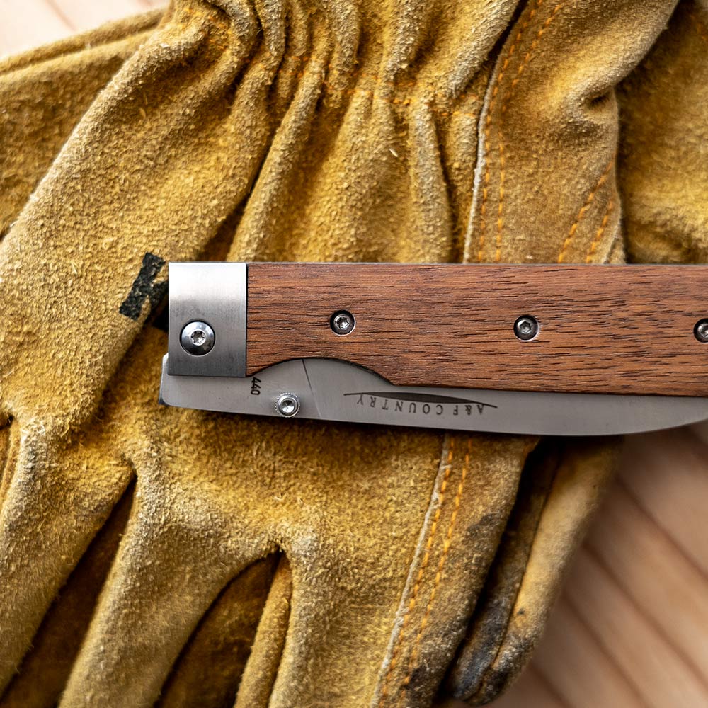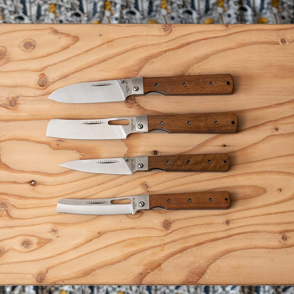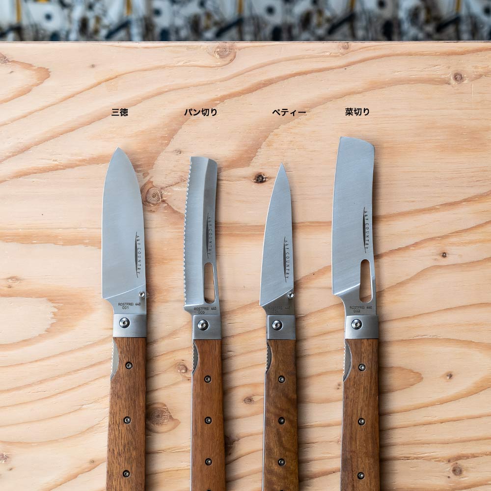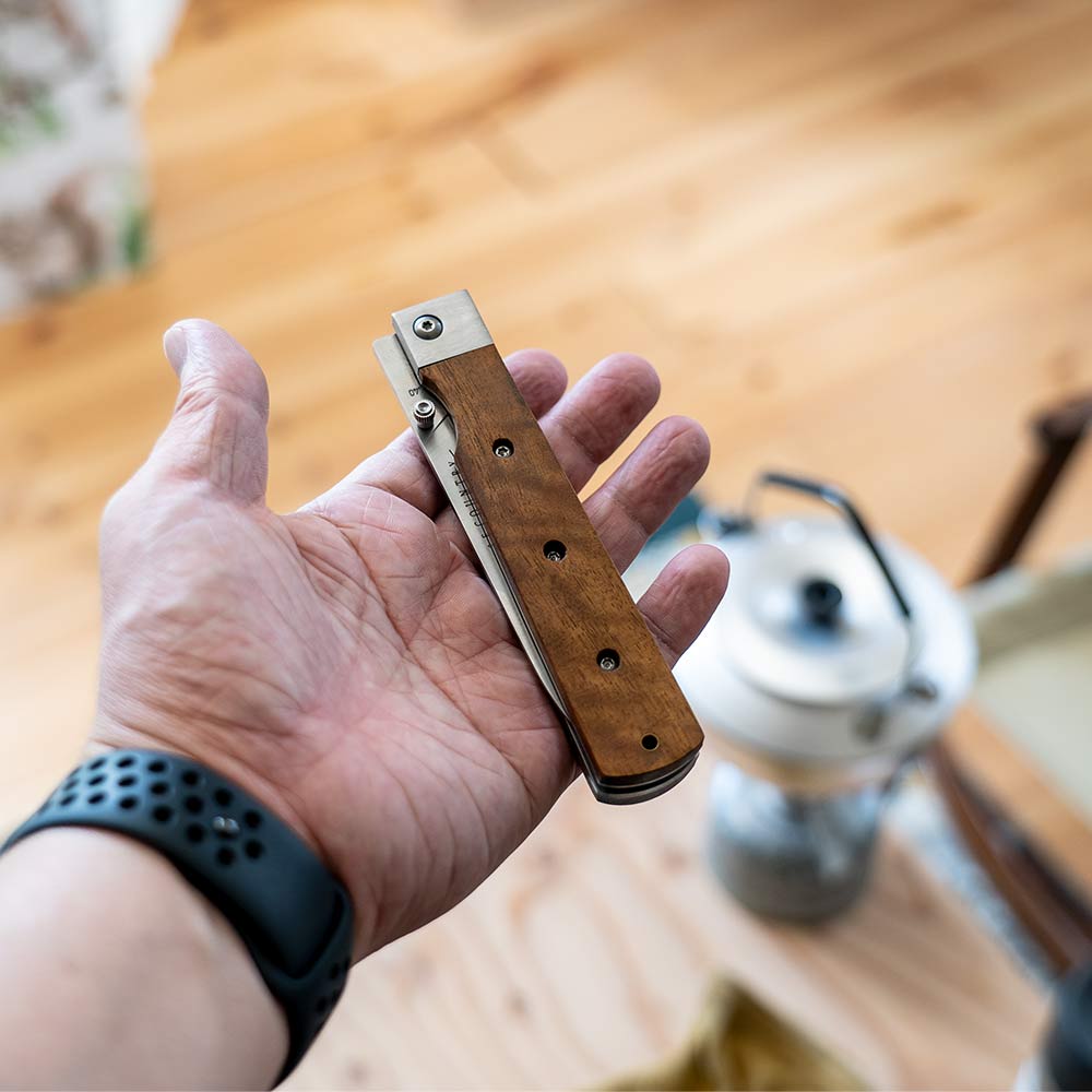持ち運びに便利、さらに片手で素早くブレードを展開できるライナーロック式で、それぞれの手のひらに収まる大きさで使いやすく、それぞれの料理に対応できるようになっています。 ハンドルは固い木材のタガヤサン天然木を使っていて、ブレードには錆に強い440Cステンレスを採用しています。