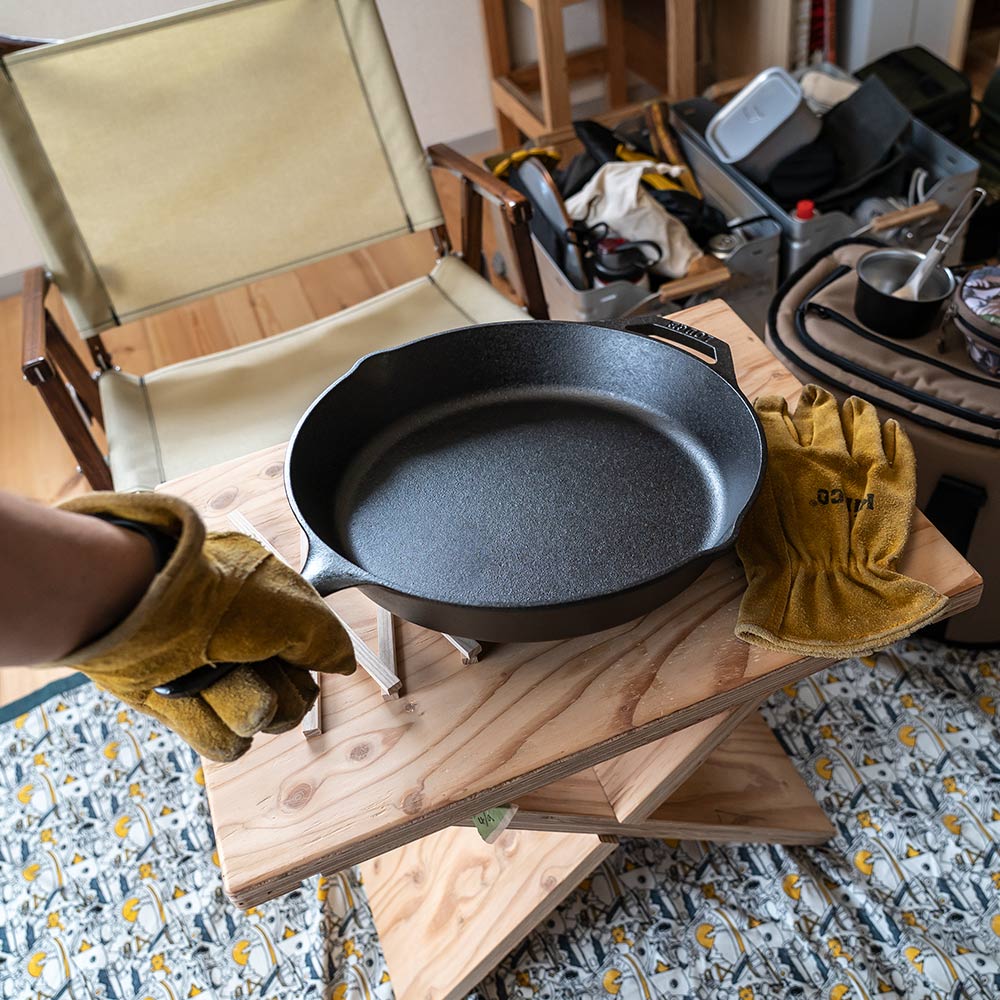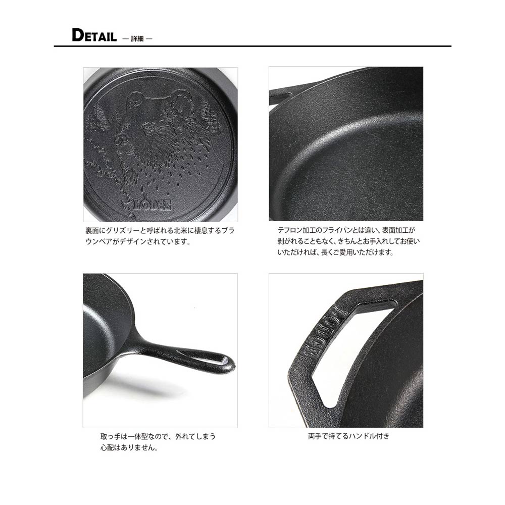 12インチ(内径29.9cm)で、アメリカでも人気のサイズです。大家族のステーキを一気に焼いたり、煮込み料理にもお勧めです。ハンドル(柄の部分)の反対側にアシストハンドルがあり、両手で持ち上げることができ扱いやすいデザインです。スキレット全体が5mmの厚みで、鉄の蓄熱力を上げ、焼く、蒸す、炒める、煮るなど全ての調理法に適しています。スキレットの調理はスキレットカバー(別売りの蓋)があるとより調理の幅を広げ、性能を発揮します。 ■”Lodge Wildlife Series”はアメリカの野生動物をモチーフにしたシリーズで、12インチにはヒグマがデザインされています。警戒心の強いオスのbrown bearが描かれています。