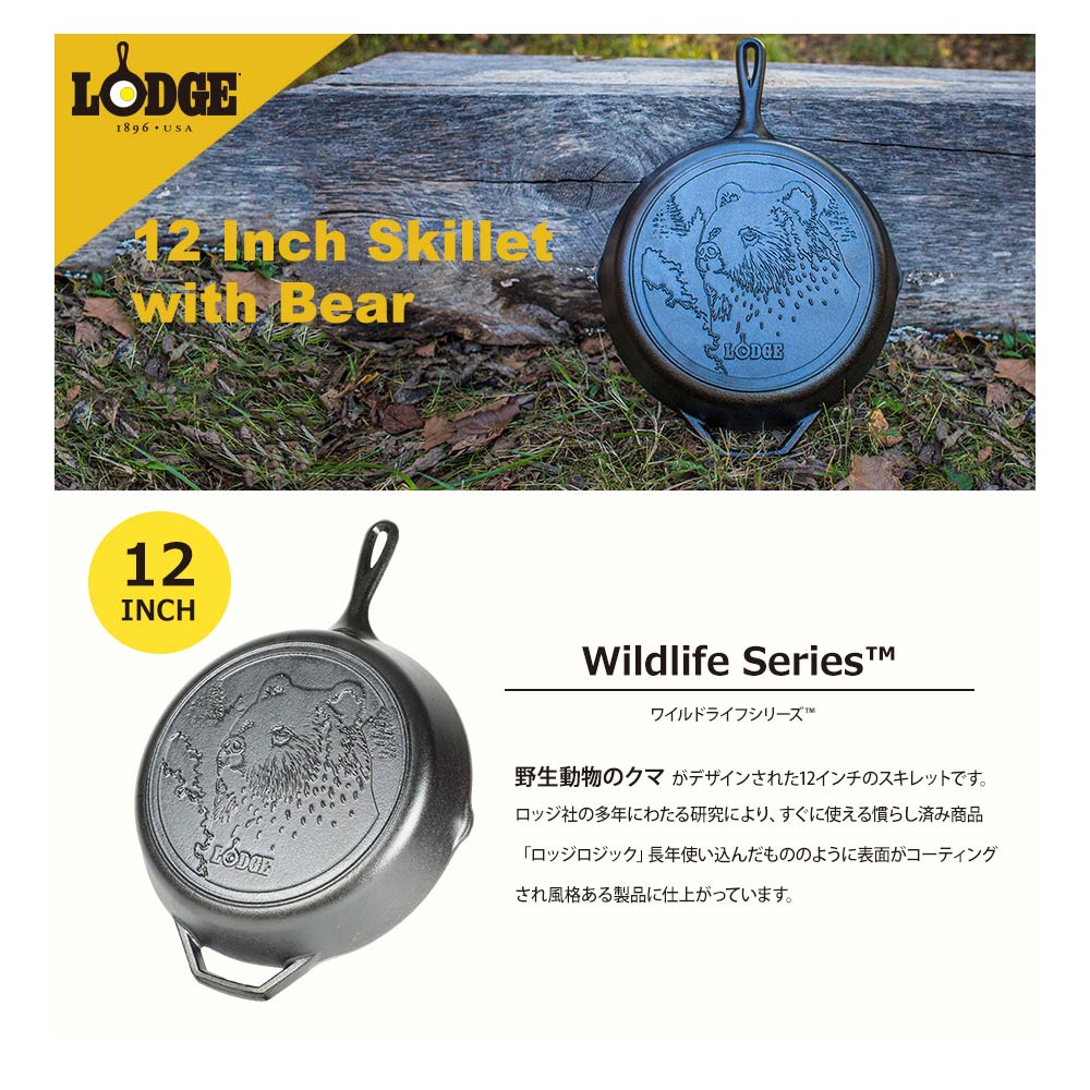 LODGE ロッジ スキレット 12インチ ベアロゴ L10SKWLBRは120年余りの歴史があるLODGE(ロッジ)社のスキレット(フライパン)です。裏面に熊がデザインされています。