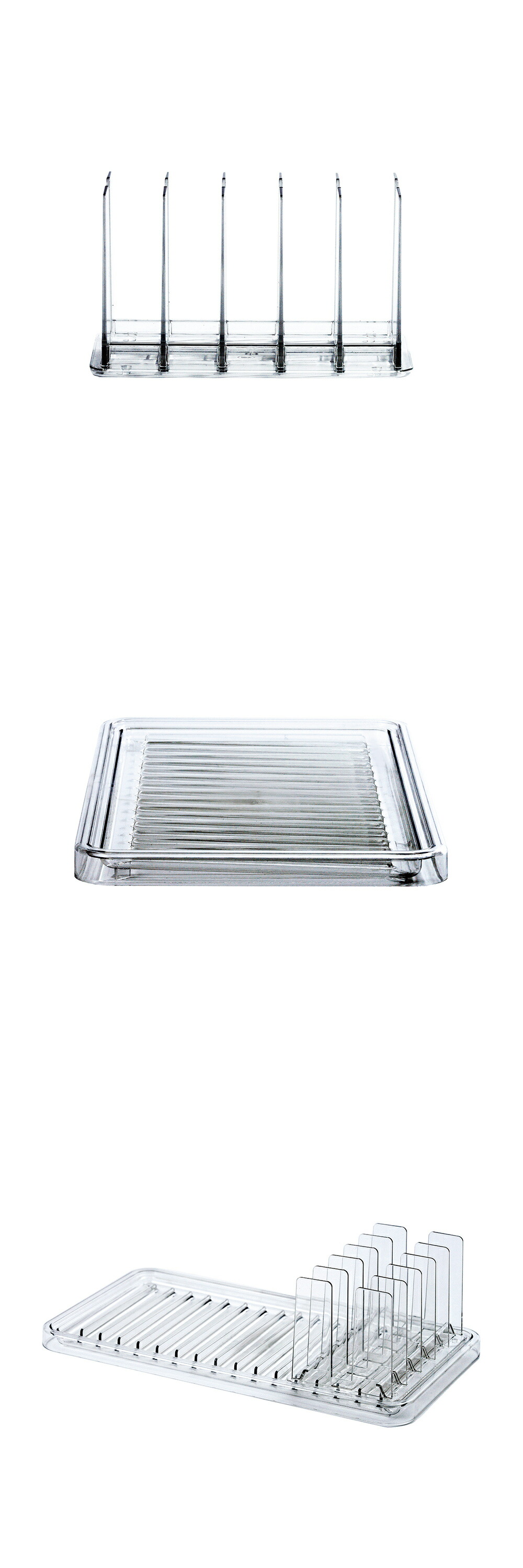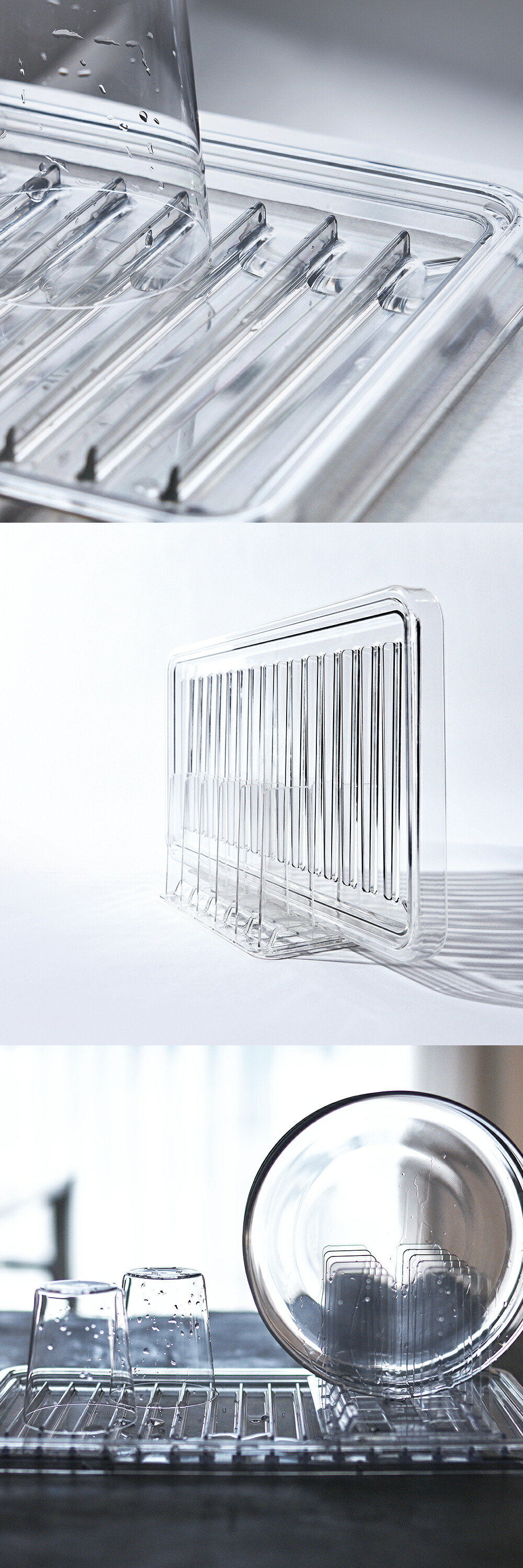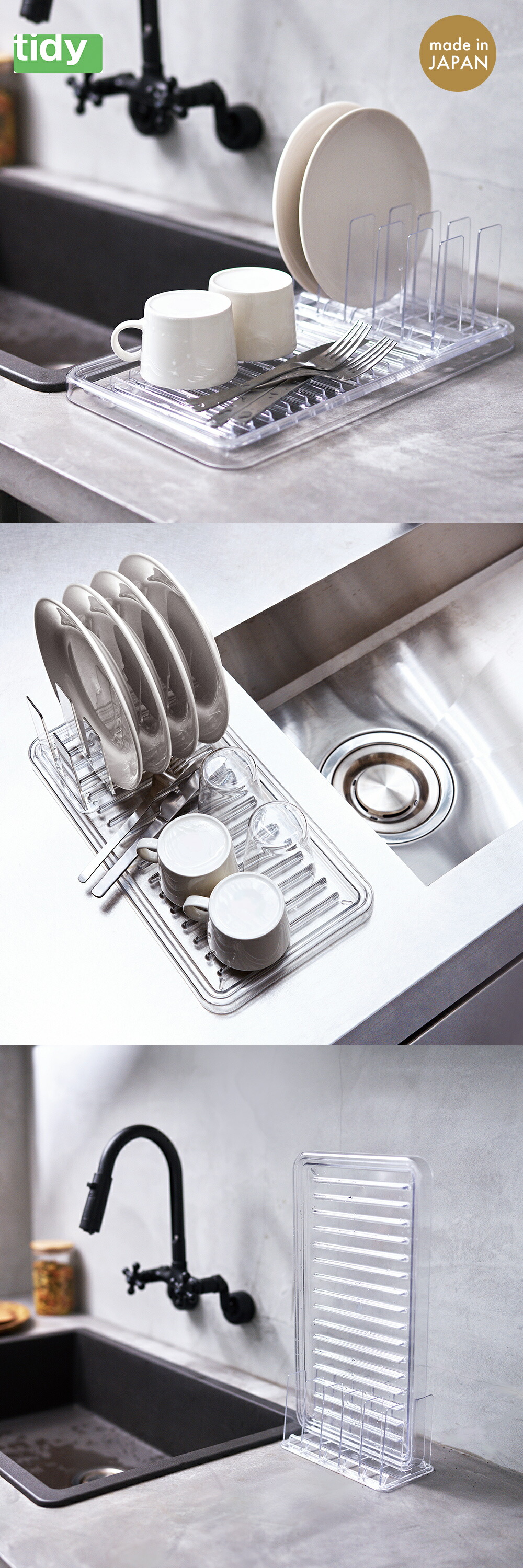 透明な素材が、空間を遮らず軽やかな印象に。大きすぎず小さすぎず、ちょうどいいサイズ感の水切りラックです。グラスやお皿を安定して立てられます。