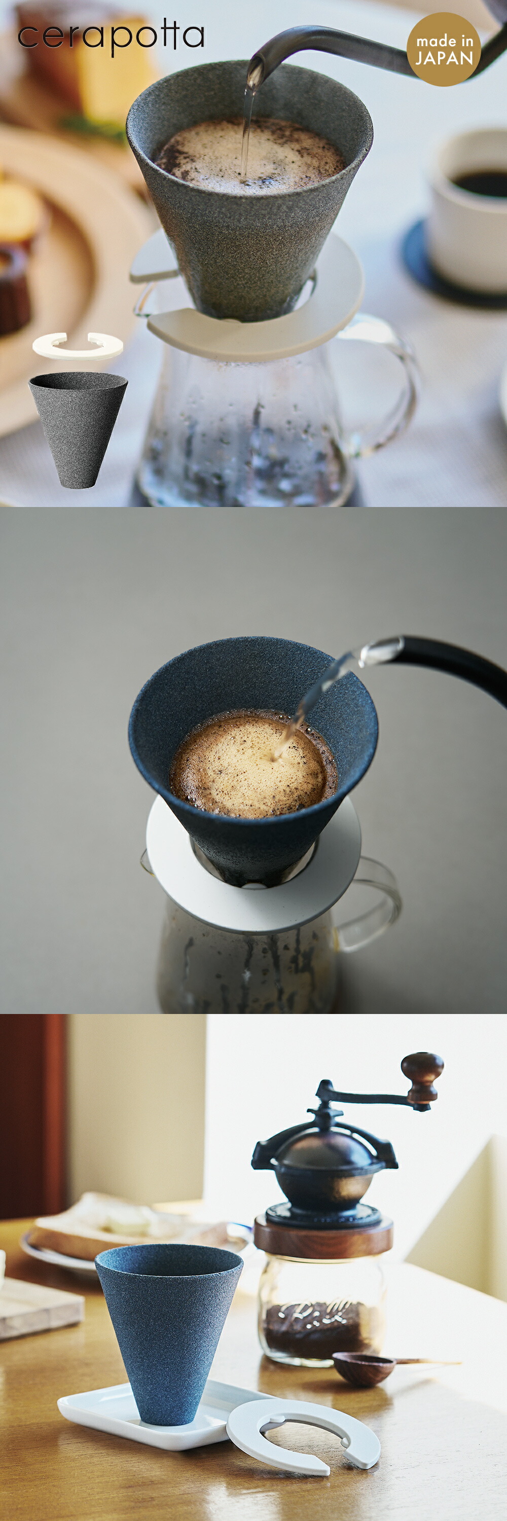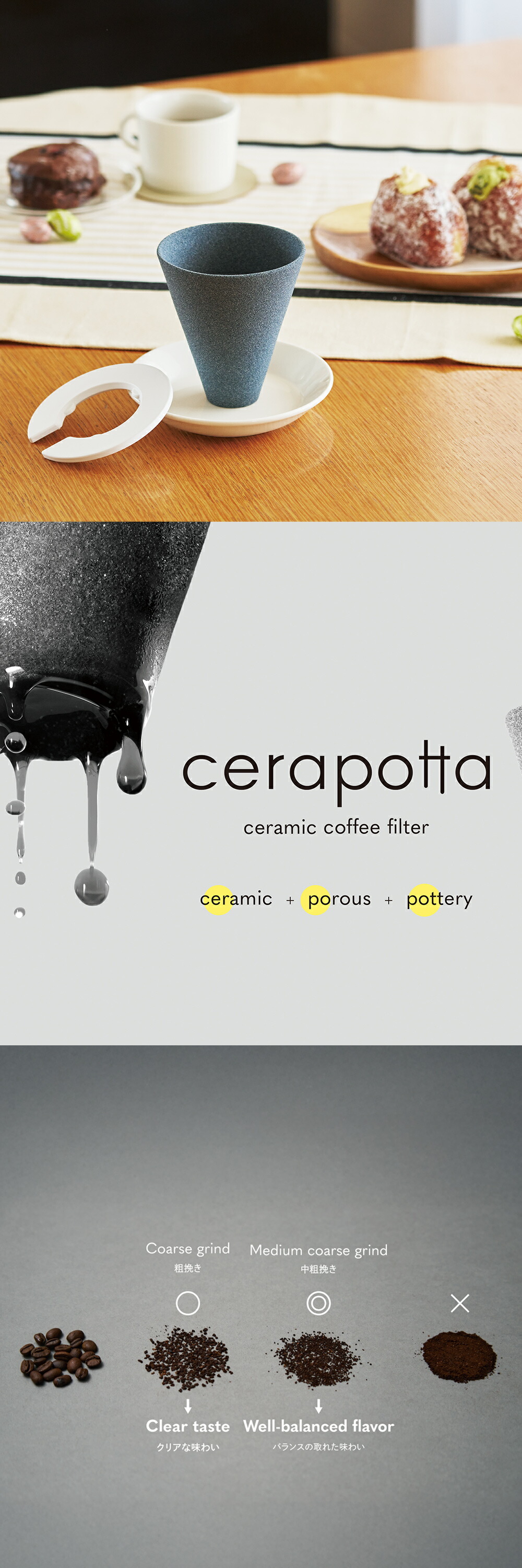 香り、コク、口当たり。一杯のコーヒーを丁寧に味わうためのフィルター、「cerapotta」。髪の毛よりも細かな孔を持つセラミック素材が、余分な雑味だけをそっと濾し取り、まるで湧き水で淹れたようなまろやかな口当たりを生み出します。