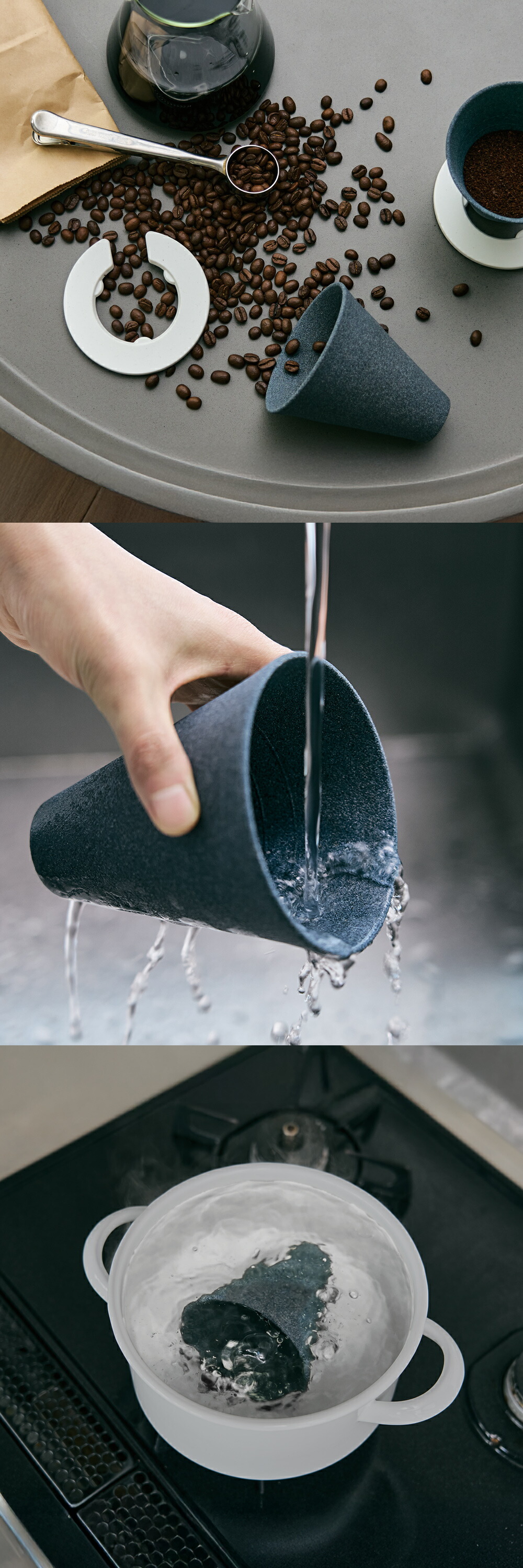 使い終わったら水でさっと洗うだけ。詰まりを感じたら、煮沸や電子レンジで簡単にリフレッシュできます。紙フィルターは不要で、繰り返し使えるためゴミも出ず、環境にもやさしい設計。