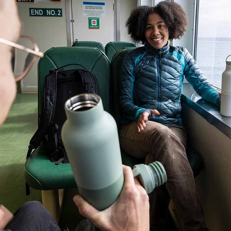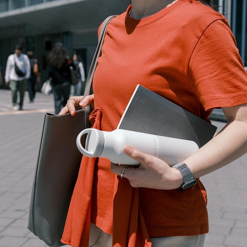 手になじみやすく、トートバッグやバックパックにもスムーズに収まる人間工学に基づいたすっきりとしたフォルム、落ち着いたカラーリングに、さりげなく調和したトーンのロゴはどんなシーンにも馴染みながら、しっかりとした存在感を放ちます。