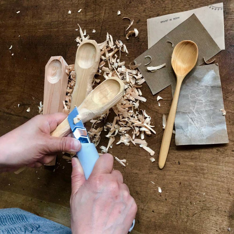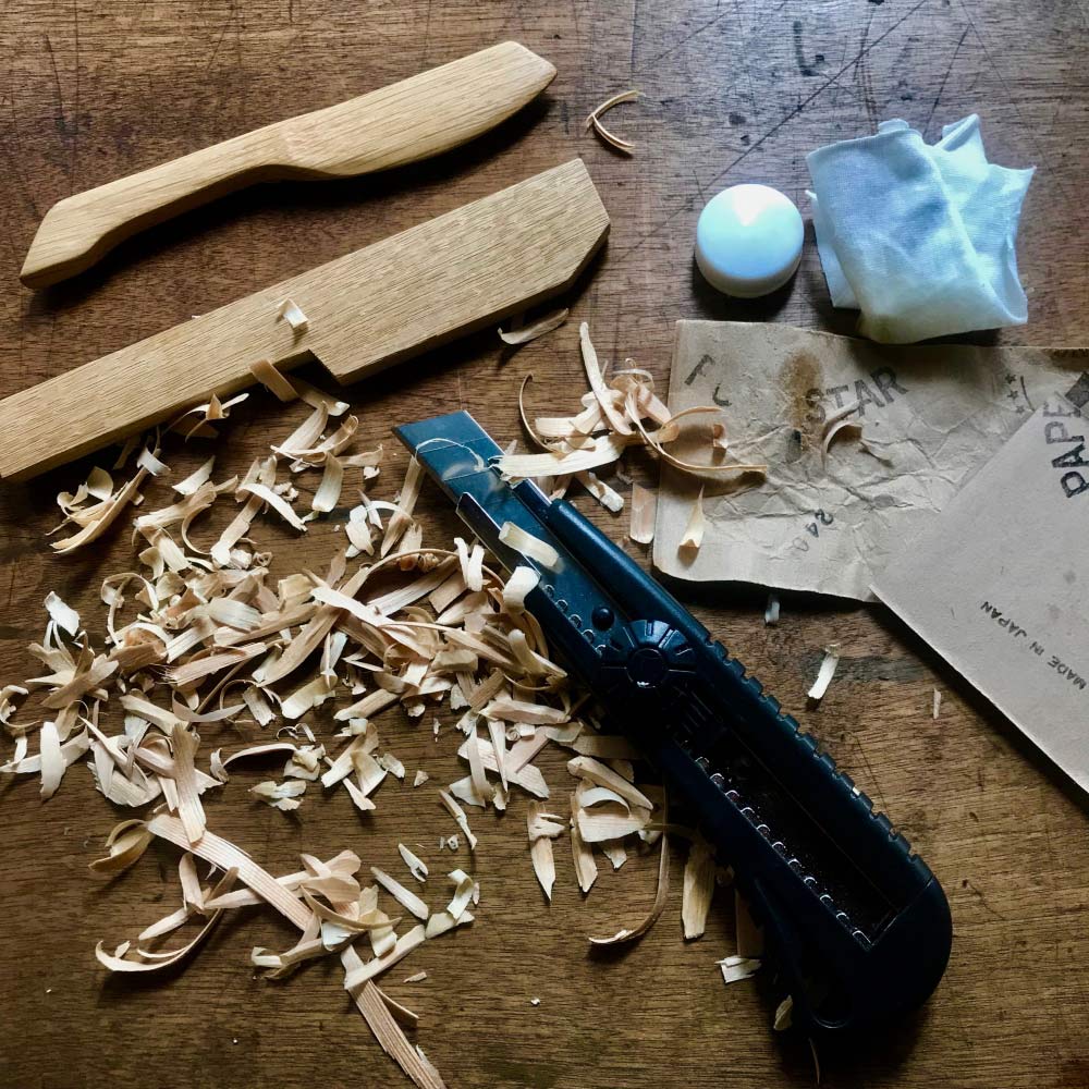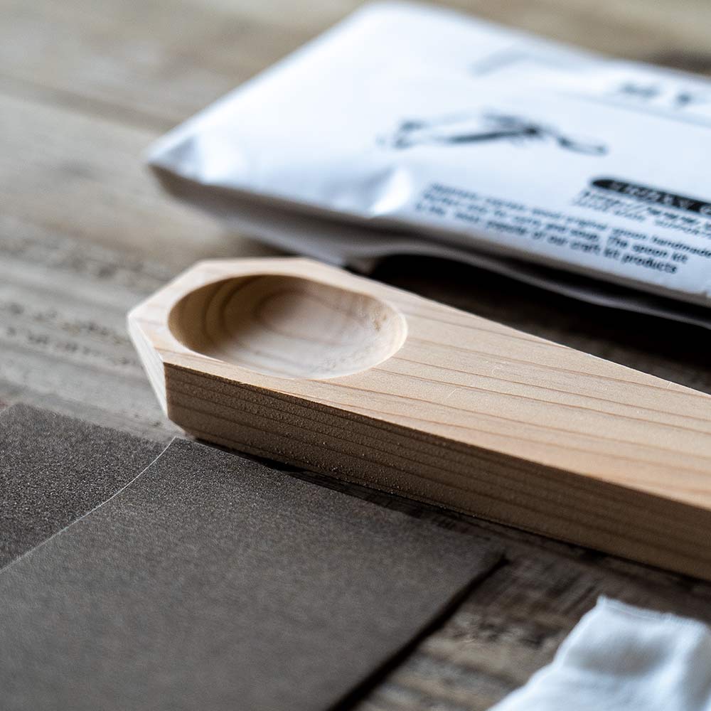 お手持ちのカッターナイフで自分好みに木材を削って、 付属のサンドペーパーとミツロウで仕上げれば、世界に1つだけのオリジナルが完成!!
