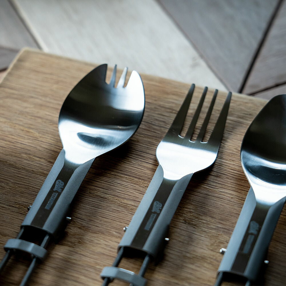 Esbitのポケットストーブの発明以来、「小さくて軽く折り畳み可能」というコンセプトがEsbitの優先事項でした。 このコンセプトはカトラリーにも活かされています。折りたたみ可能なチタン製のカトラリーは、非常に軽量でコンパクトになるという利点だけでなく、スプーンの深さからもわかるように使いやすく設計されています。柄と留め具を含むすべてのコンポーネントはチタン製で、カトラリーの先端部は光沢仕上げされています。エスビットのチタン製ポットに付属のメッシュバッグには、折りたたんだカトラリーが2本収納出来るポケットが付いています。スプーン フォーク ナイフ スポーク