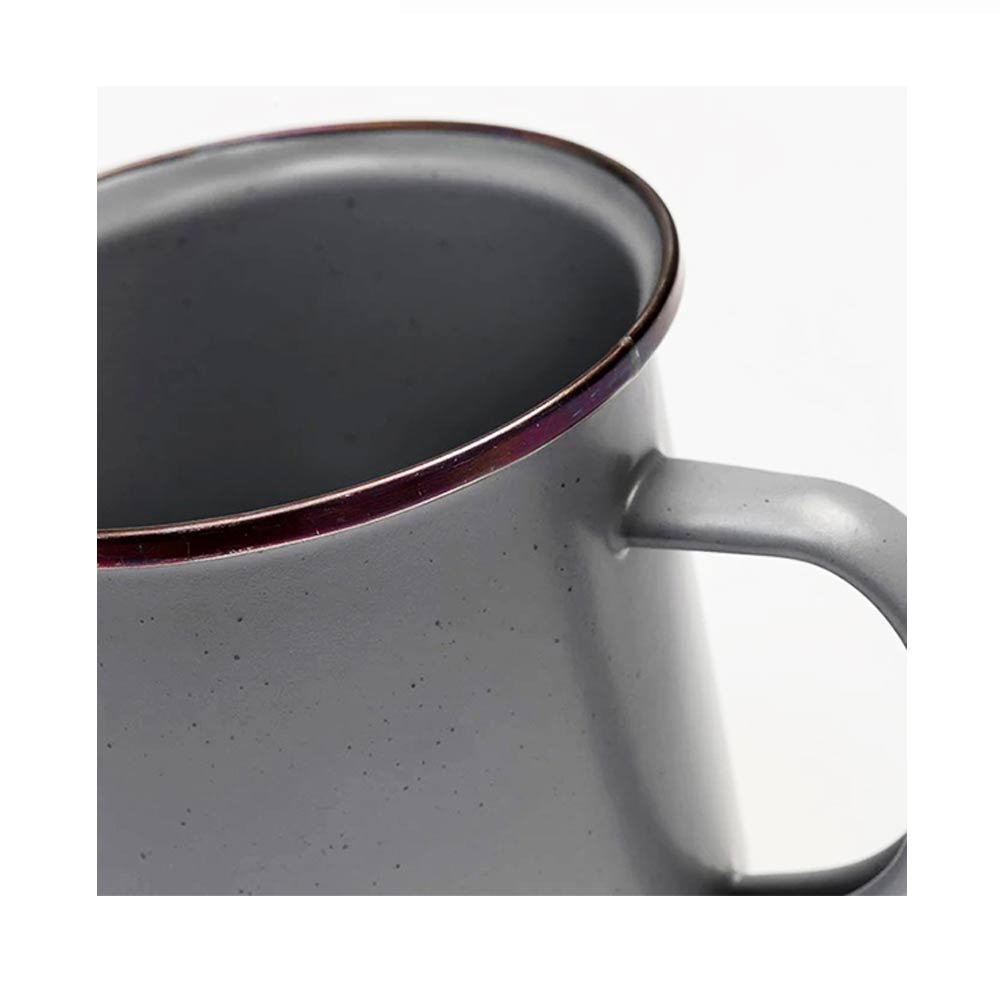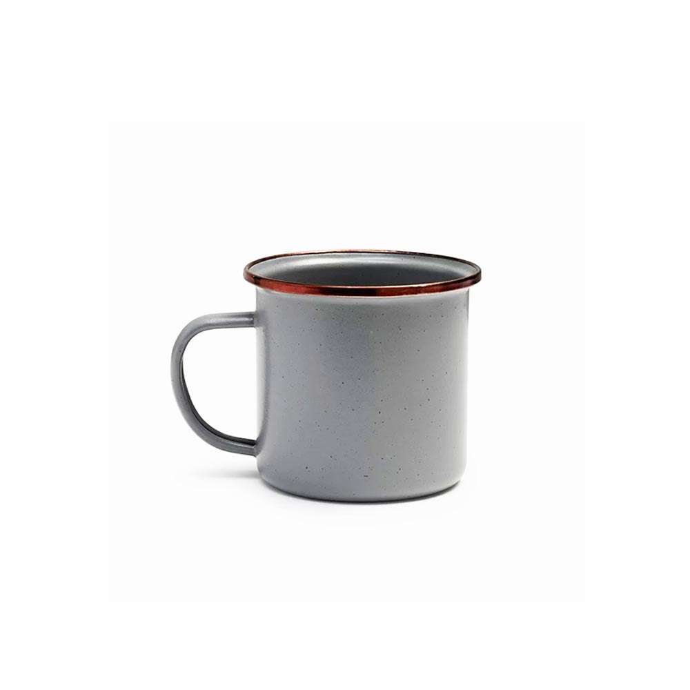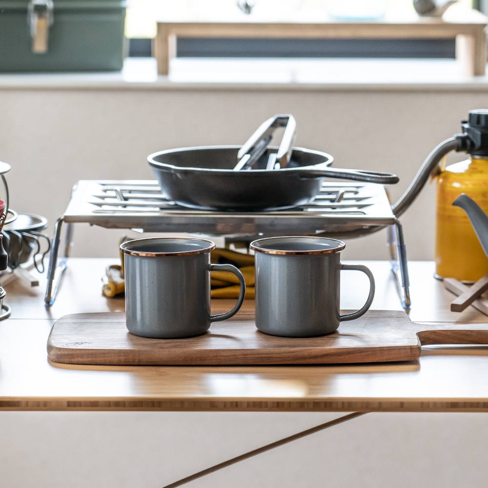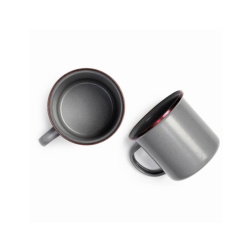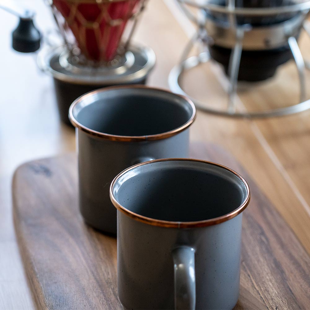 2個セットになったエナメル製のカップです。リムはステンレススチールで補強されており、リムの色はアンティーク調のカッパーカラーとなります。