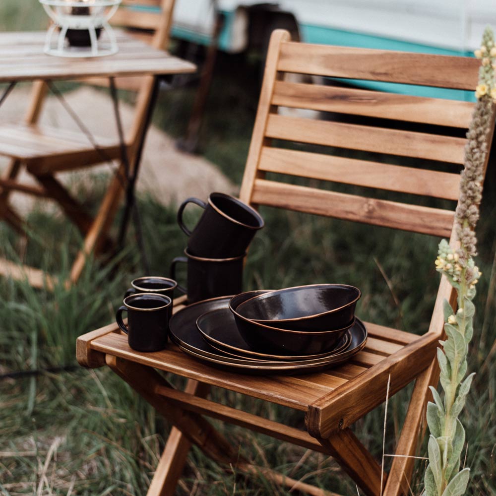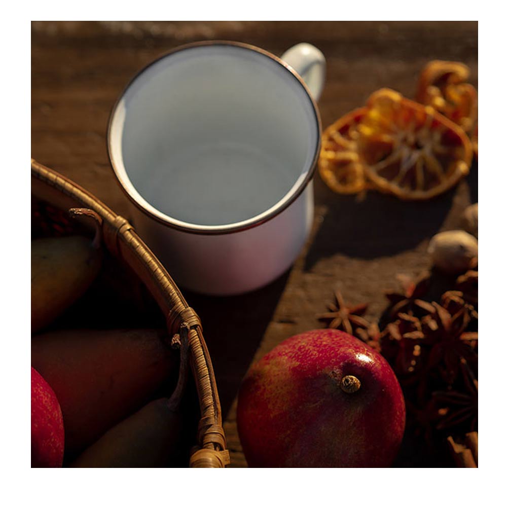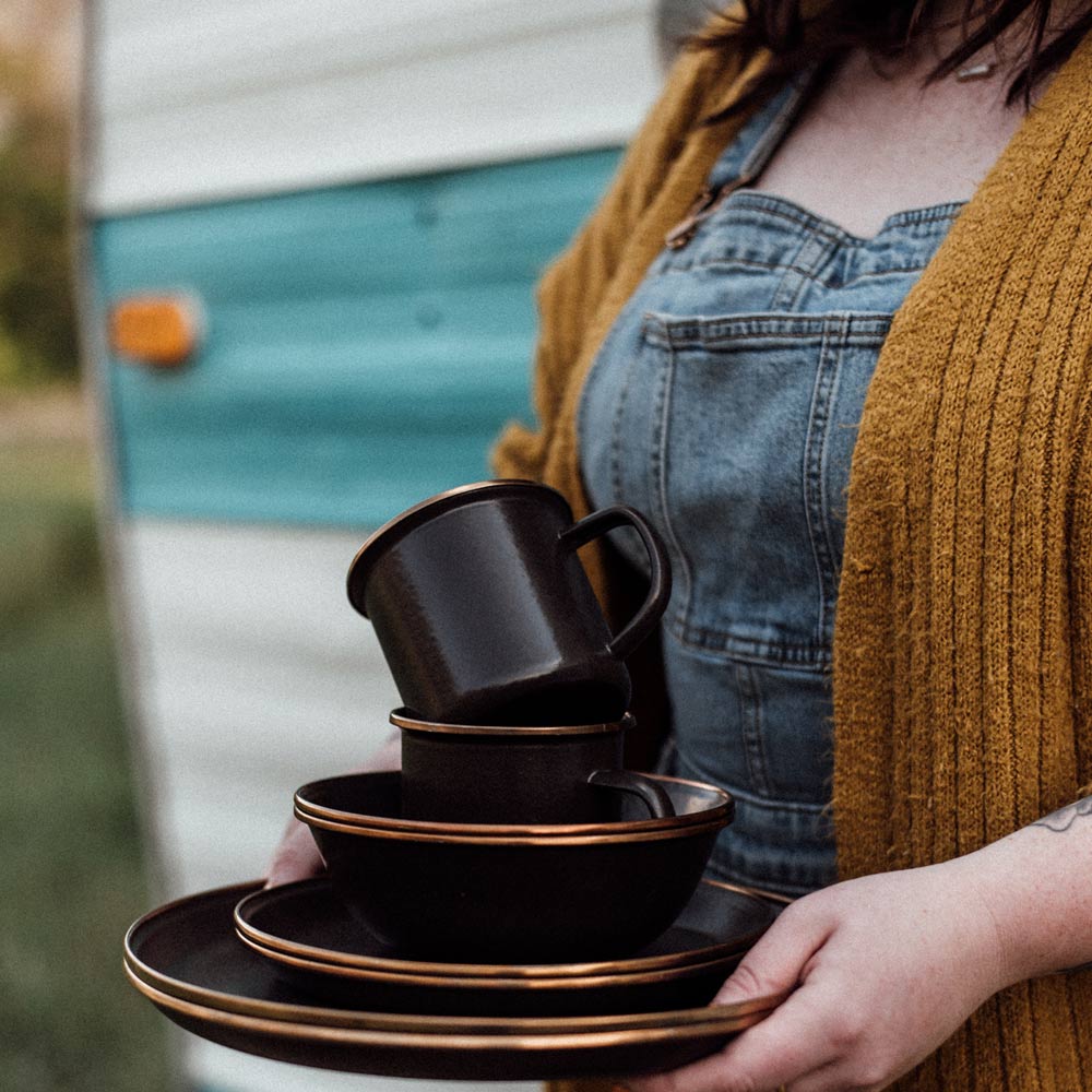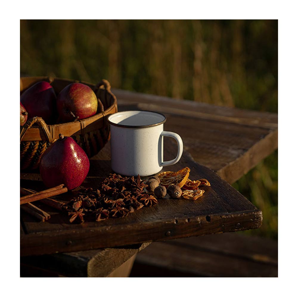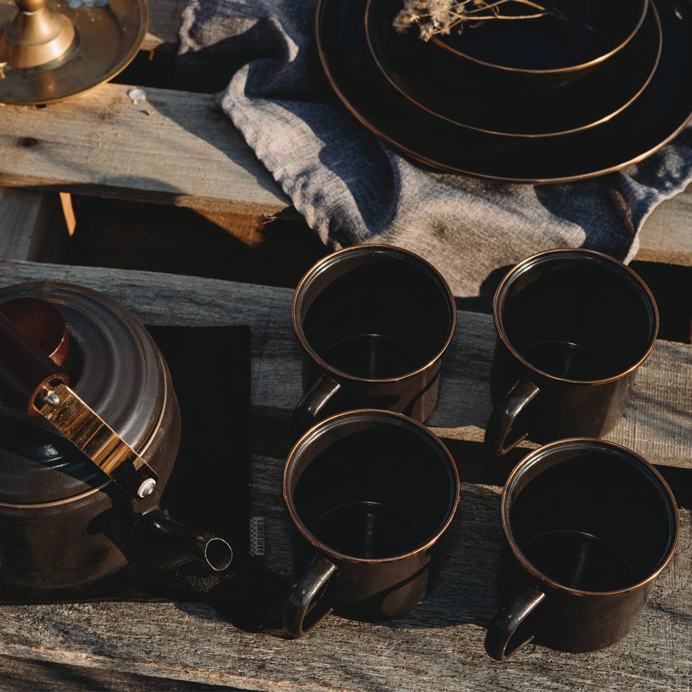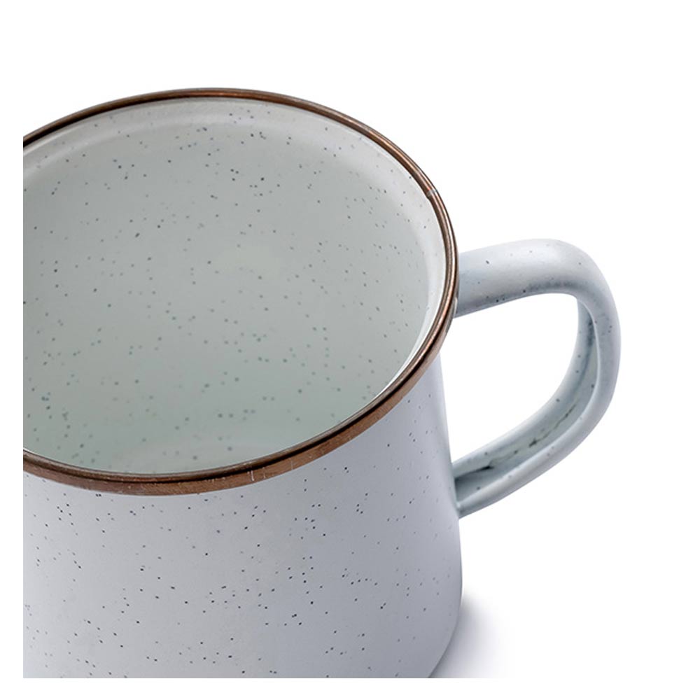 2個セットになったエナメル製のカップです。リムはステンレススチールで補強されており、リムの色はアンティーク調のカッパーカラーとなります。
