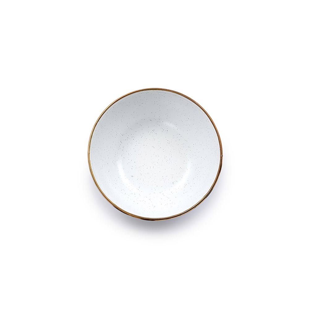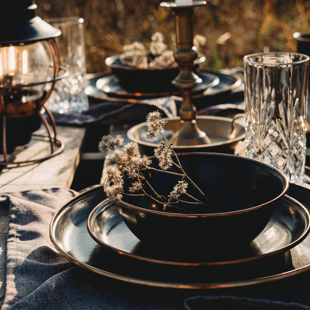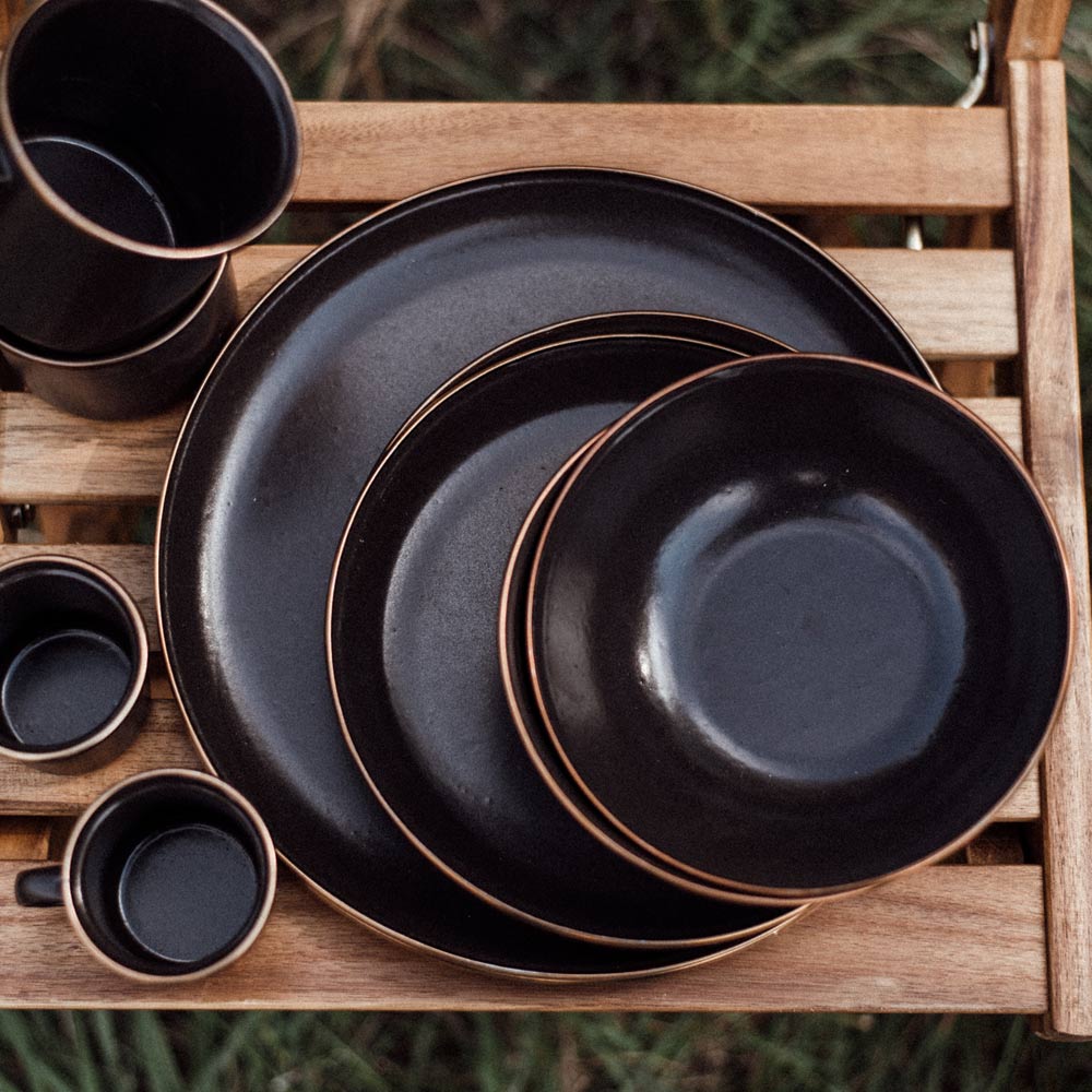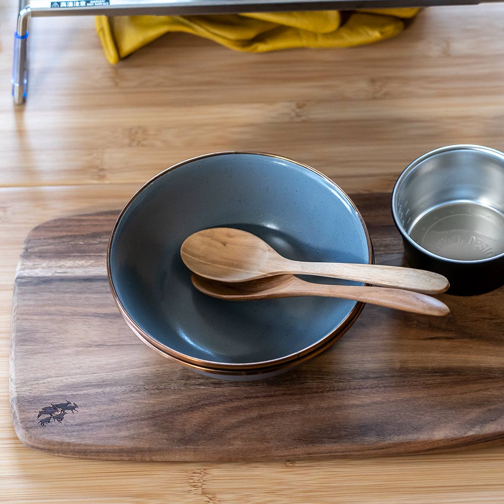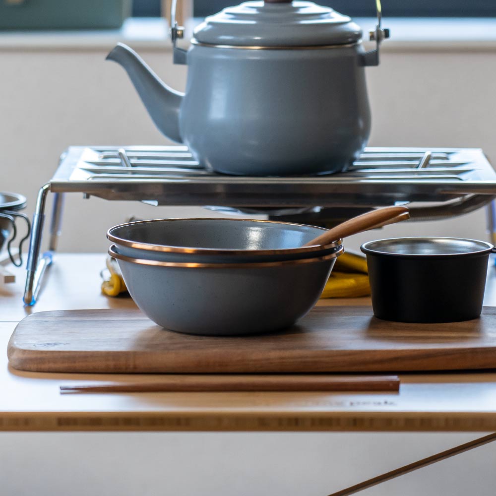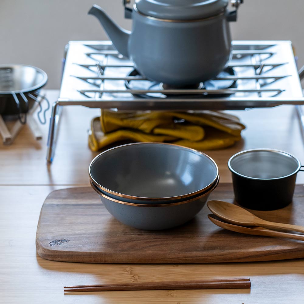 2個セットになったエナメルボウルです。リムはステンレススチールで補強されており、リムの色はアンティーク調のカッパーカラーとなります。