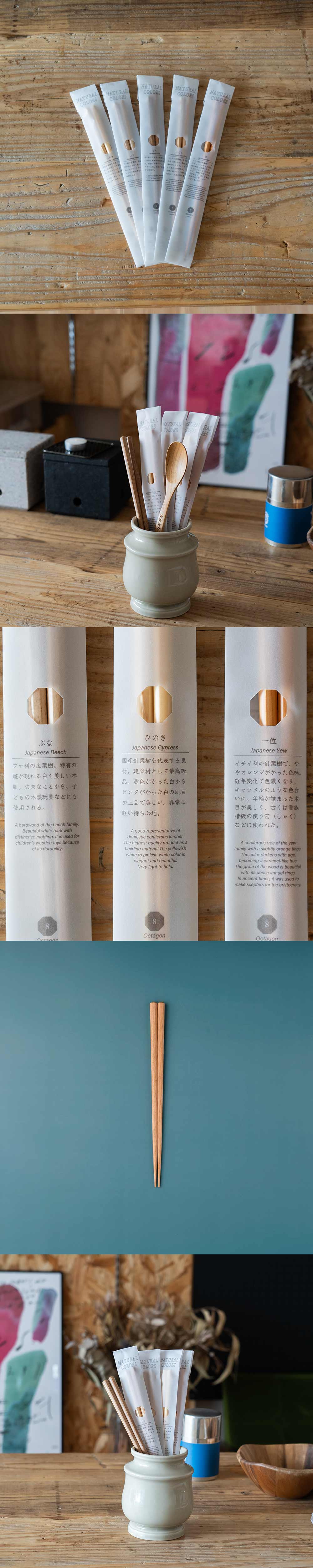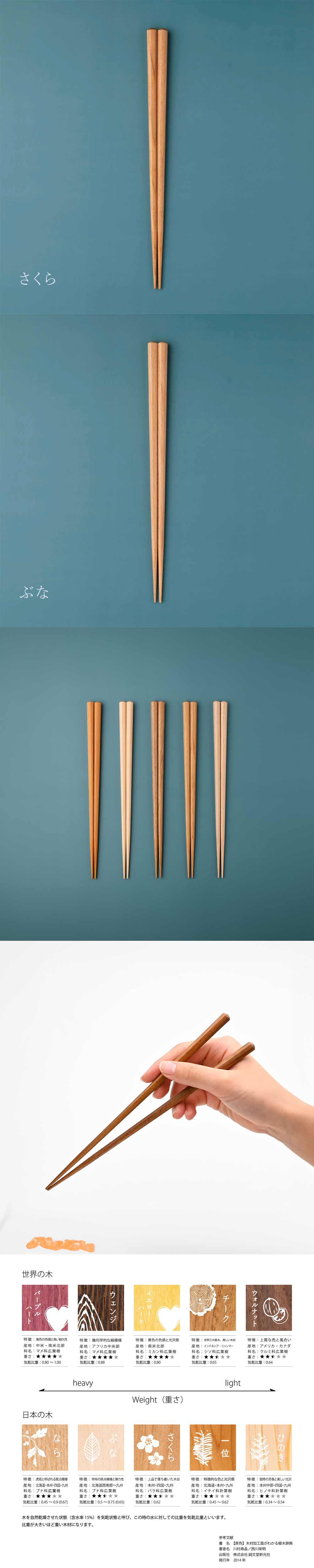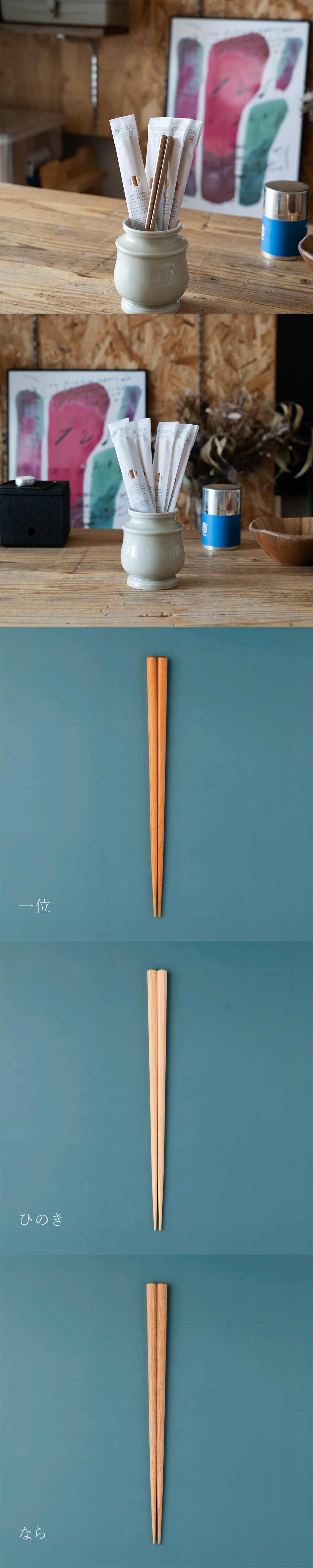 天然木ならではの風合いを生かした食洗機対応のお箸です。 樹種によって異なる、硬さ・重さ・木目の印象をお楽しみください。