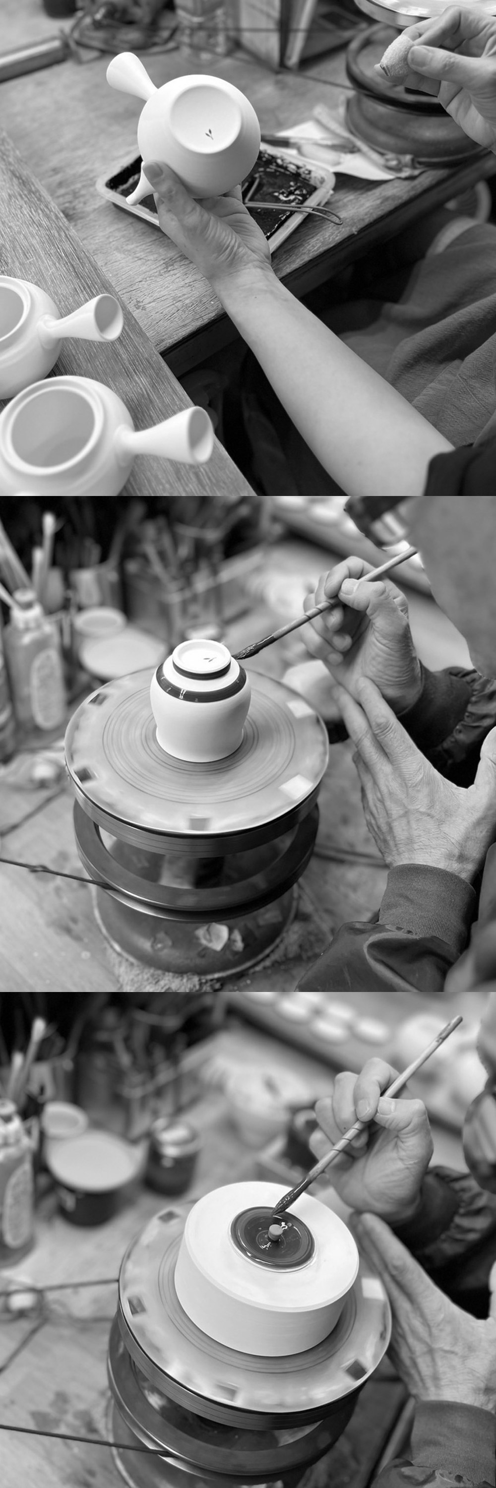 急須は、本体・蓋・茶漉し・注ぎ口・取手などのパーツを別々に成形し、