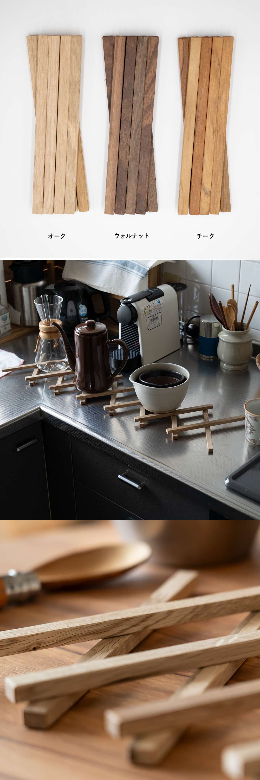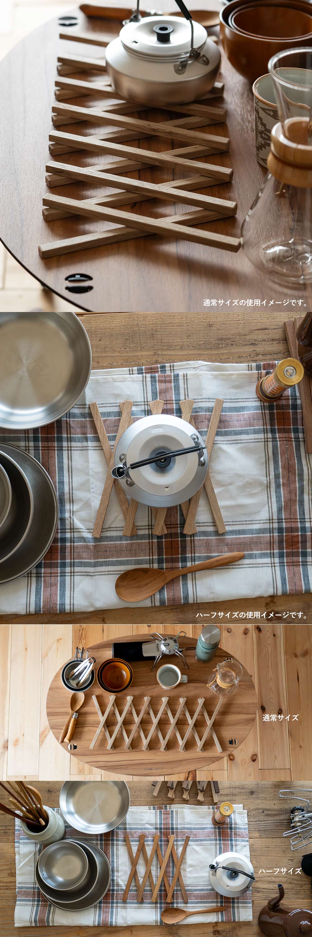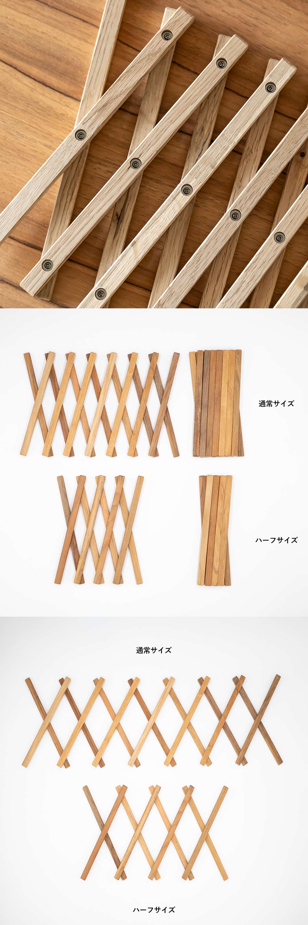 最小10cm幅~最大120cmまで伸縮自在。 同時に複数の鍋やポットなどを置くことができ、使わない時はコンパクトに折り畳めば収納場所もとりません。食卓やシンク、大事なテーブルを「熱」や「傷」から守り、 木材ならではの味わい深い色合いも同時に楽しめるアイテムです。