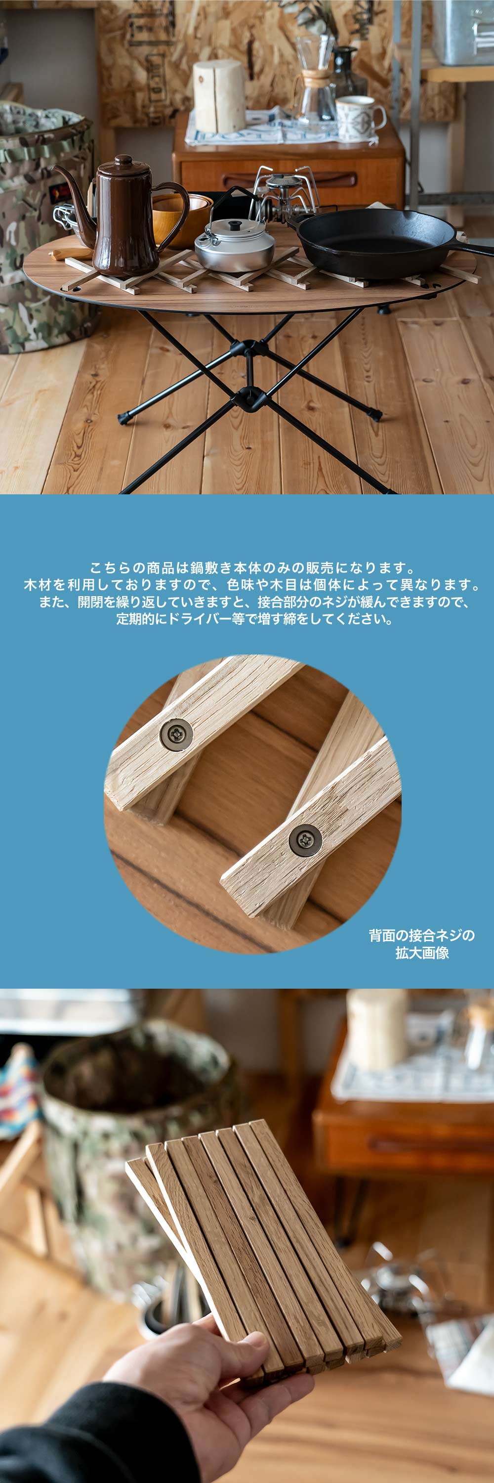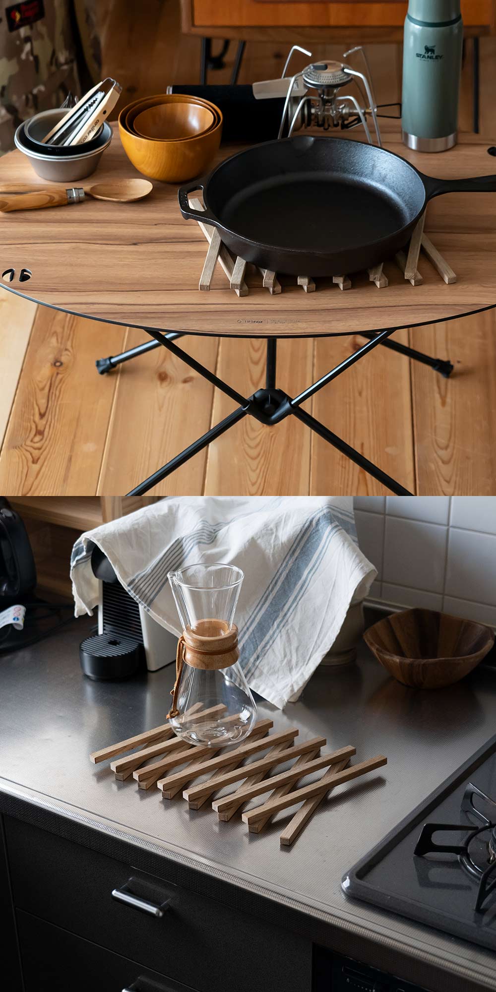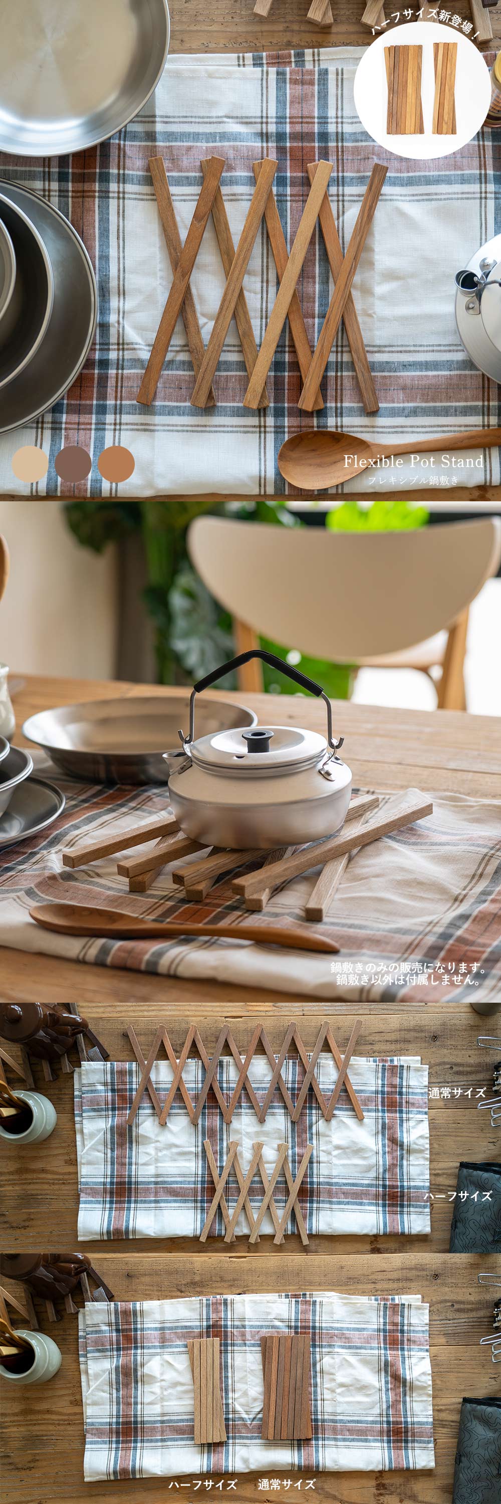 最小10cm幅~最大120cmまで伸縮自在。 同時に複数の鍋やポットなどを置くことができ、使わない時はコンパクトに折り畳めば収納場所もとりません。食卓やシンク、大事なテーブルを「熱」や「傷」から守り、 木材ならではの味わい深い色合いも同時に楽しめるアイテムです。