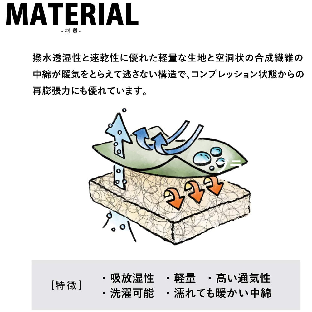 材質:アウター生地 : ポリエステル「Aqualight」 インナー生地 : ポリエステル「Supersoft」 中綿 :「Isofibre」(シリコン加工ポリエステル中空繊維)