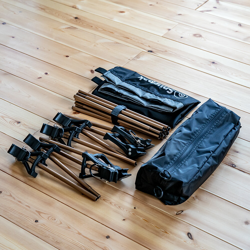 アルミ製ポール、収納バッグ、ピローポケット付属。