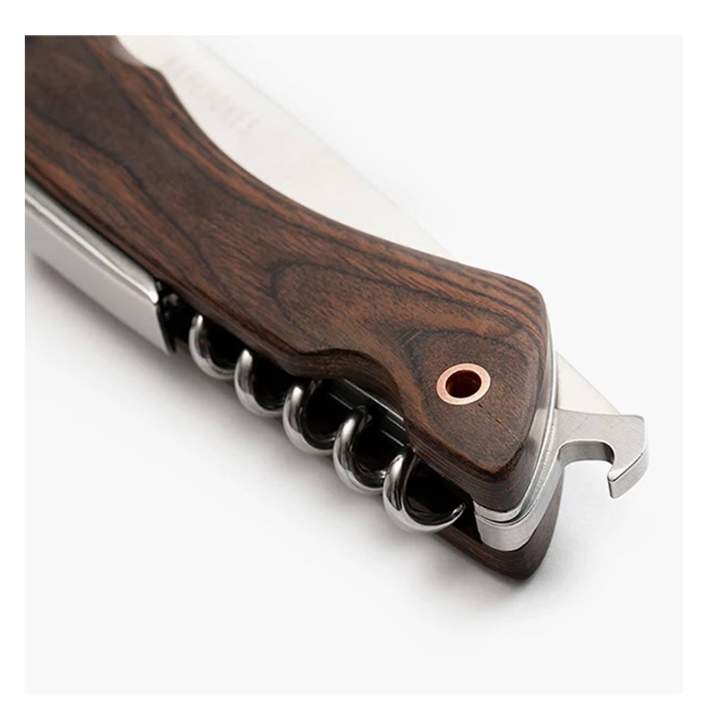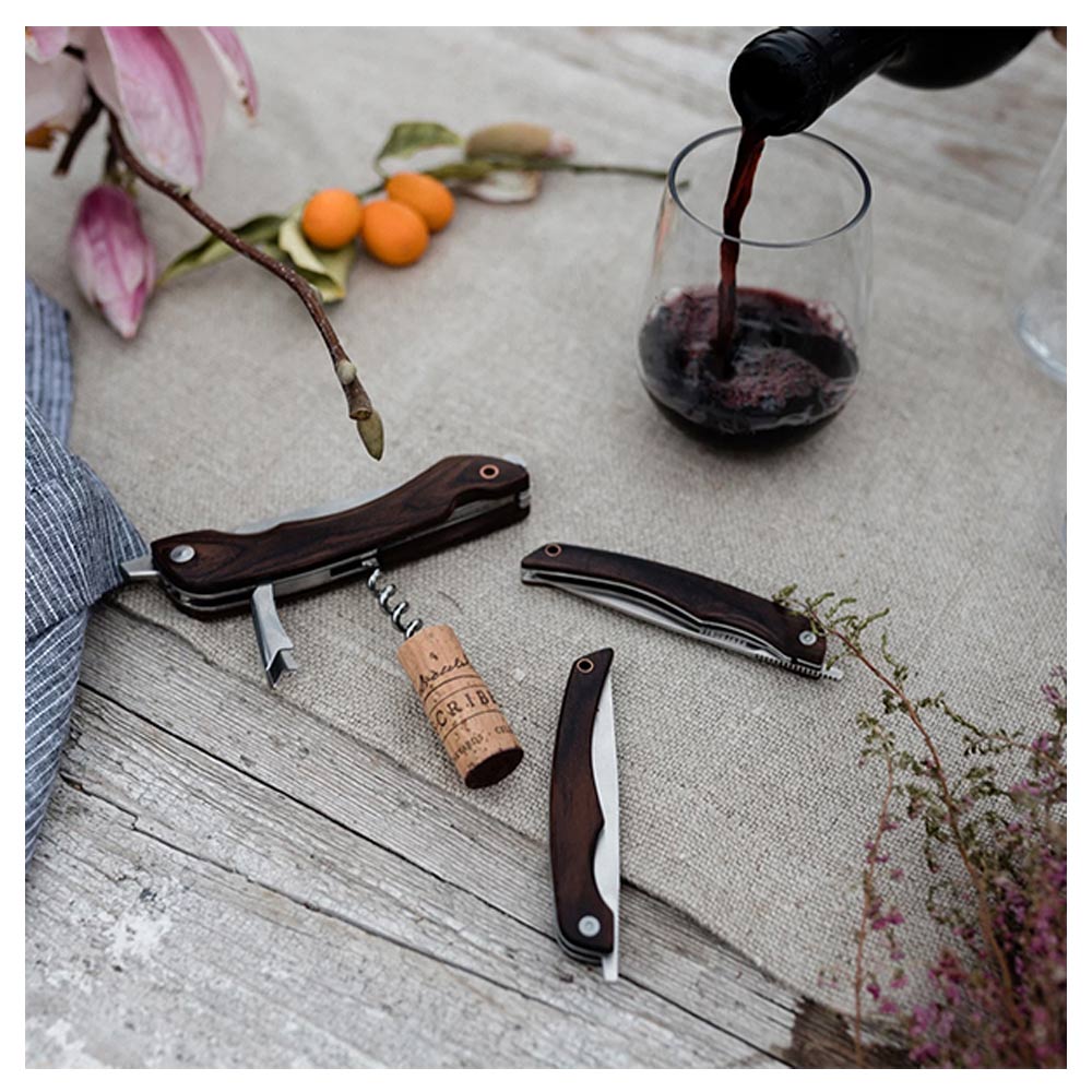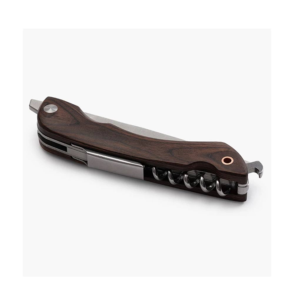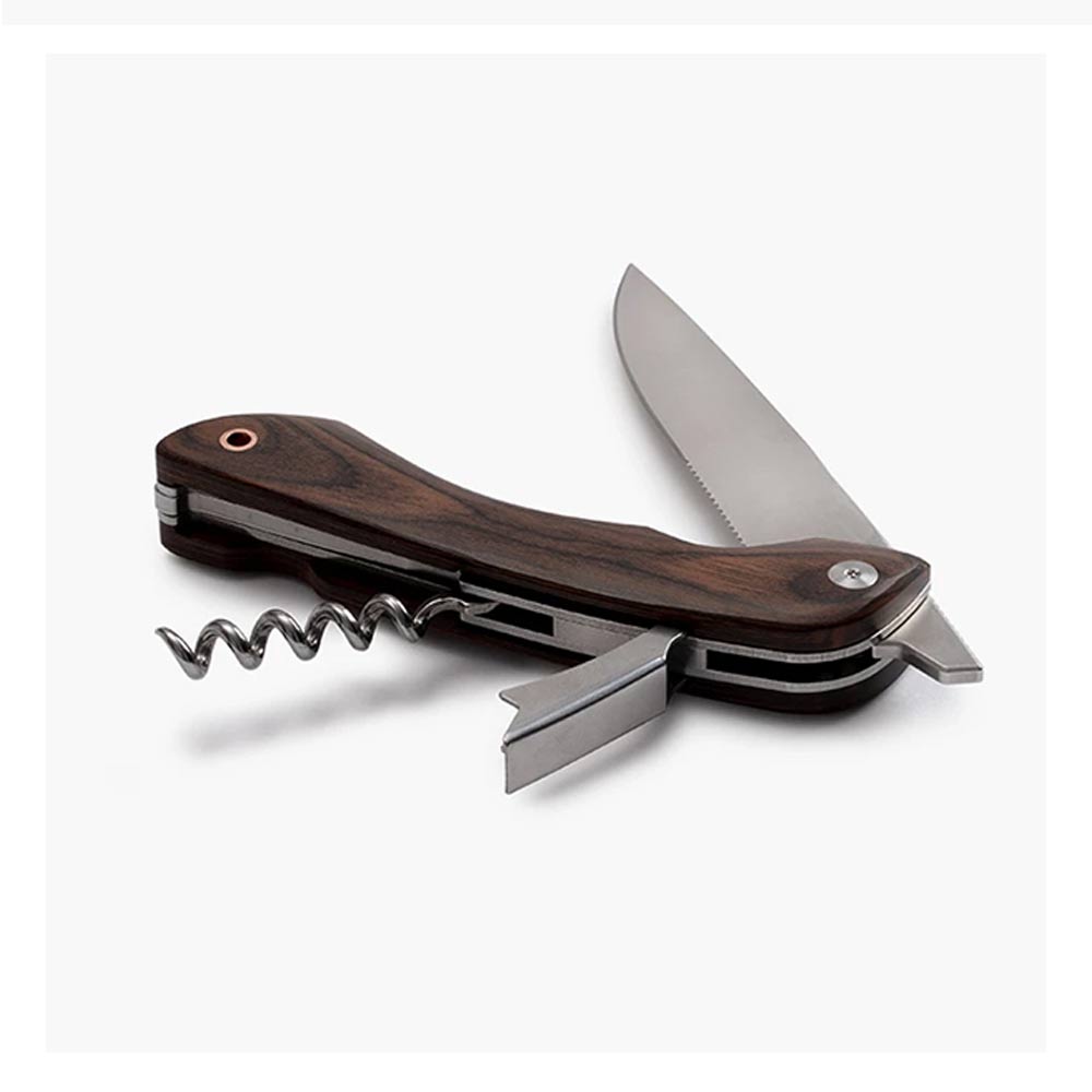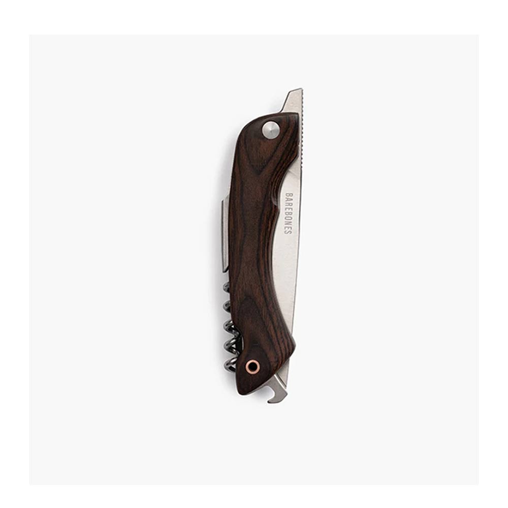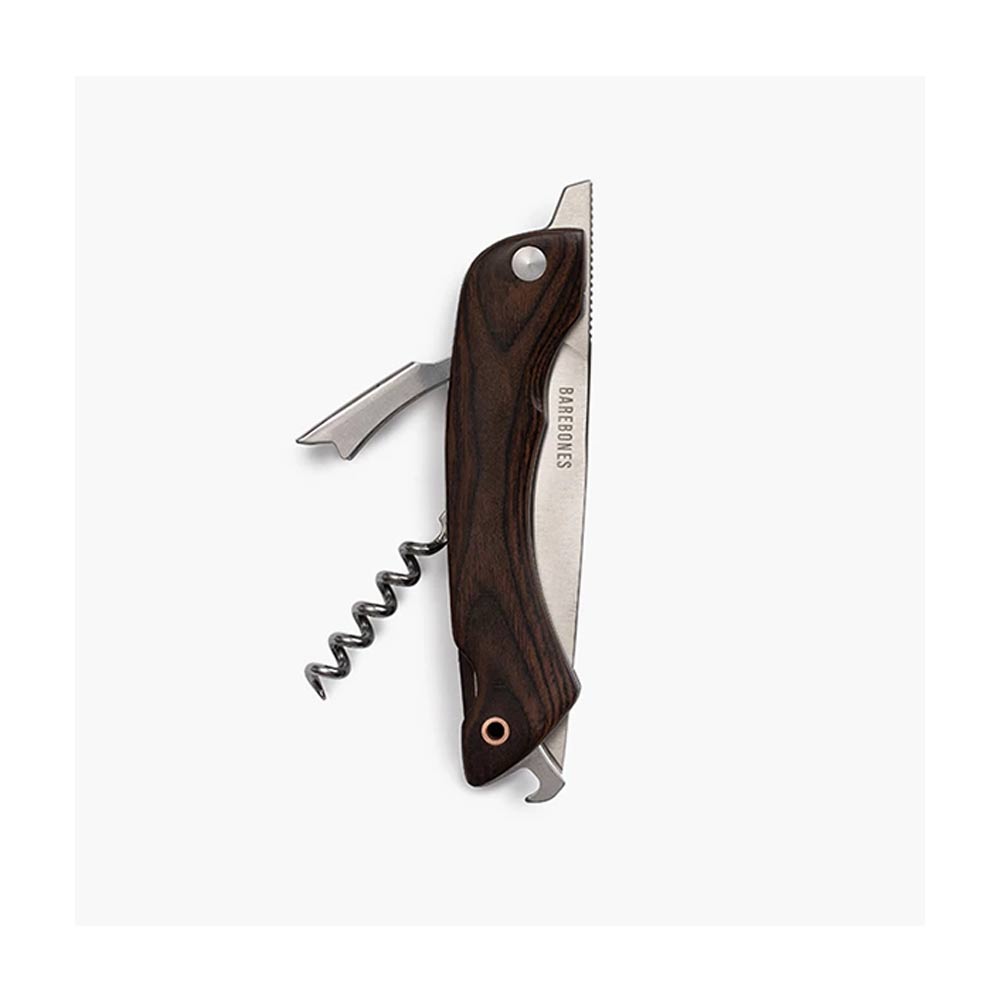 Barebones ベアボーンズ フォールディングピクニックナイフは4インチの半鋸歯状の刃の付いたナイフ、コルクスクリュー、栓抜きの付いたナイフです。 パン、肉、チーズをスライスし、ワインまたはビールの栓を抜き、その後コンパクトに収納できます。
