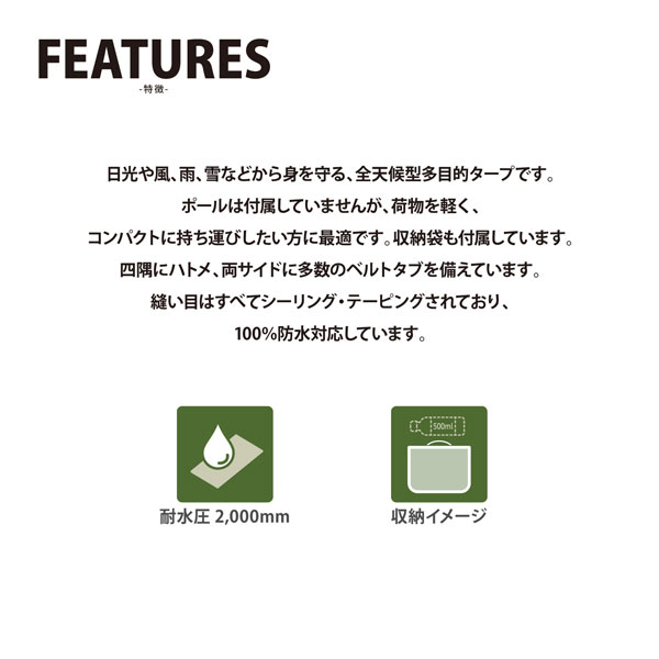 引退した軍人や熱心なアウトドア愛好家によって開発された製品。 日光や風、雨、雪などから身を守る全天候型対応。 ダイヤモンド型(斜方形)のデザインで、フライトシート、くさび型・差し掛け型などあらゆる形で使用可能。 荷物を軽く、コンパクトに持ち運びしたい方に最適。※ポールは付属してません。 タープの大きさが3m×3m、四隅にハトメ、両サイドにたくさんのベルトタブを備えています。 フライシートとして使用時には背骨に3つのベルトタブを装備し、4mのガイロープ(長さ調節可能)が4本と、8本の軽量合金ペグを付属しています。