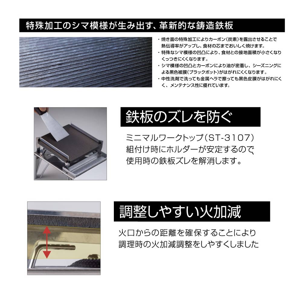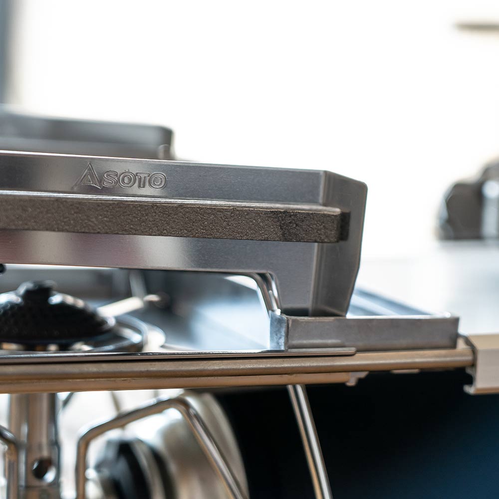 使用時に鉄板のズレなく、ホルダーがジャストフィット。火口からの距離を確保し、調理時に火加減の調整をしやすいように設計。