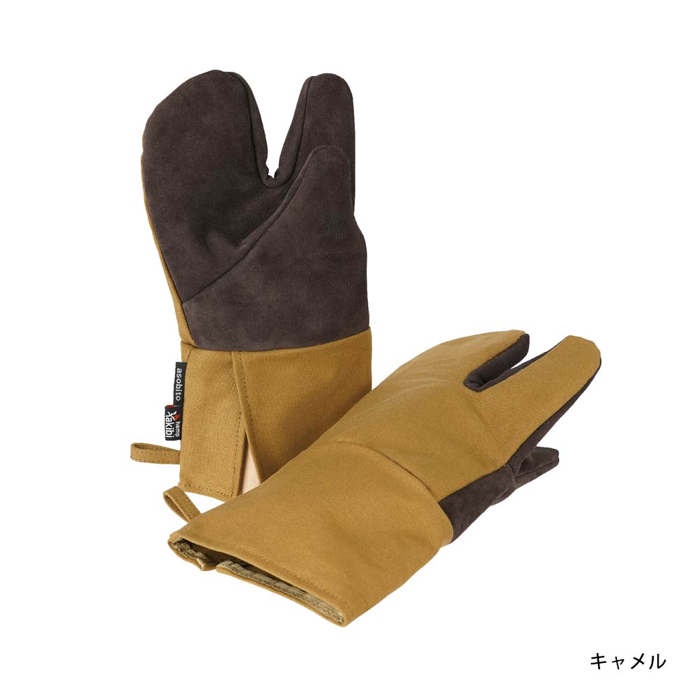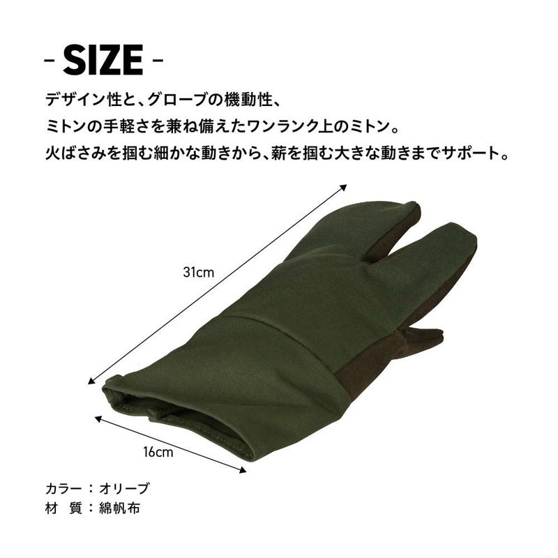 焚き火の動作を考慮し、トリガーフィンガー仕様。親指は手のひら側に向け縫製し、ミトンにはない動作性と掴みやすさを追求。