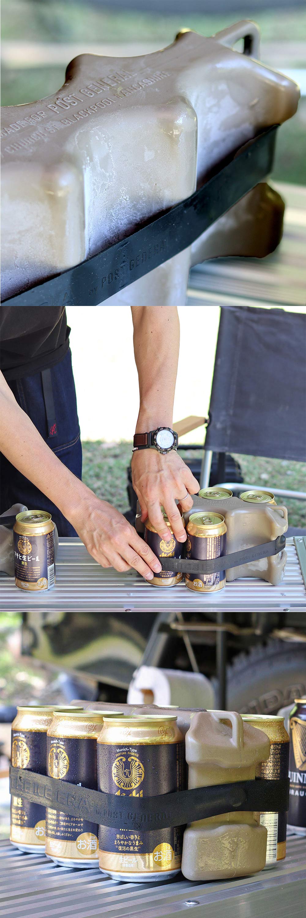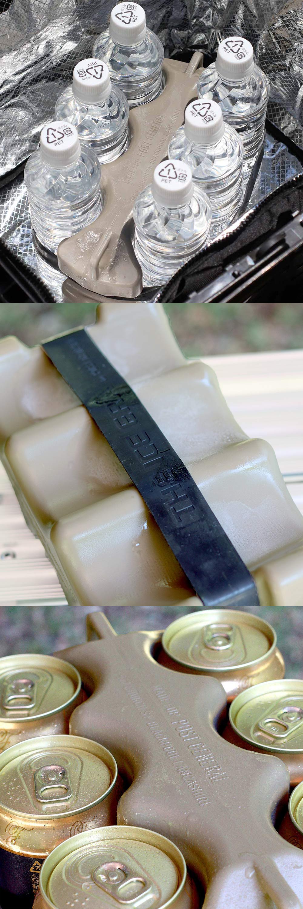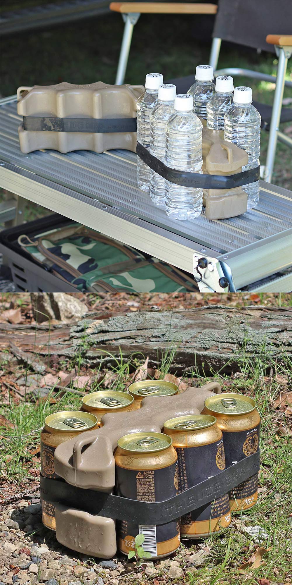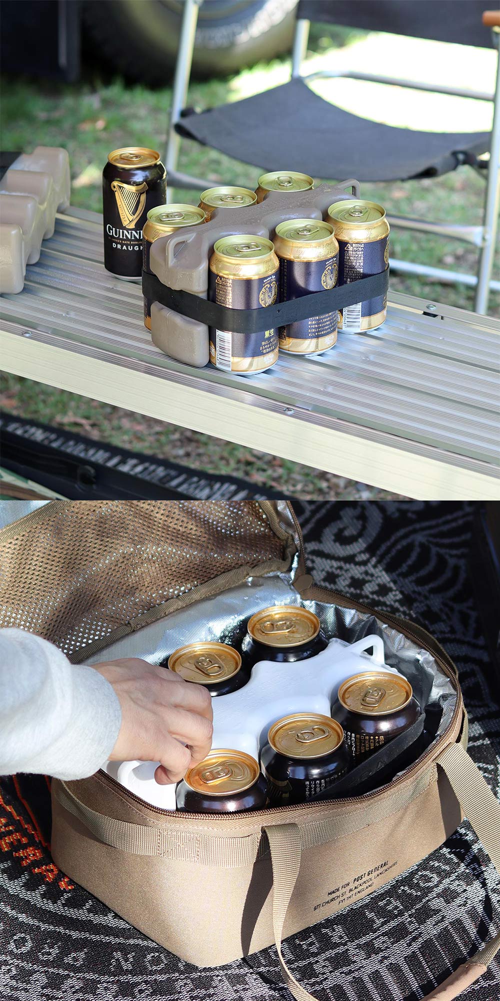 350ml缶や500ml缶、ペットボトルを効率的に保冷する事に特化させた形状で、付属のシリコンバンドで固定する事で、クーラーボックス内でも、常に保冷剤と缶が接地した状態となり保冷効果を高めるデザインです。