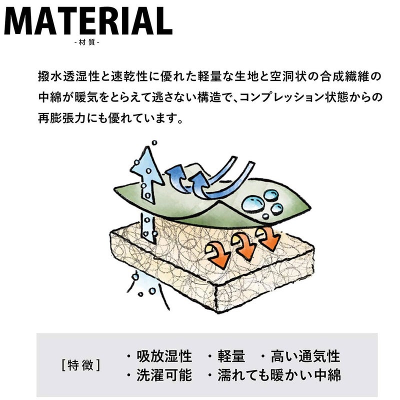 ■材質/アウター生地 : ポリエステル「Aqualight」インナー生地 : ポリエステル「Supersoft」中綿: 「Isofibre」(シリコン加工ポリエステル中空繊維)