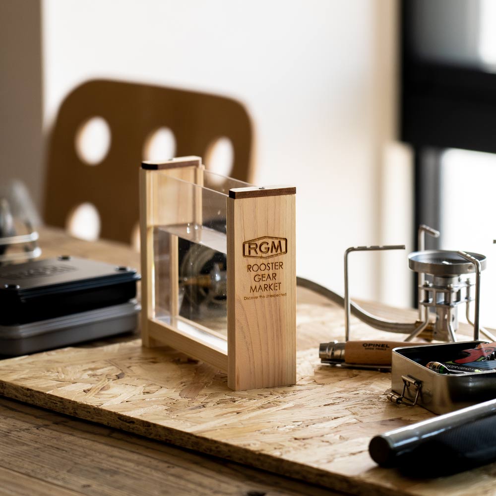 フレーム片面にはRGMロゴをレーザー刻印し、国産ヒノキには耐水加工を施してあるので多少の水かぶりは気になりません。