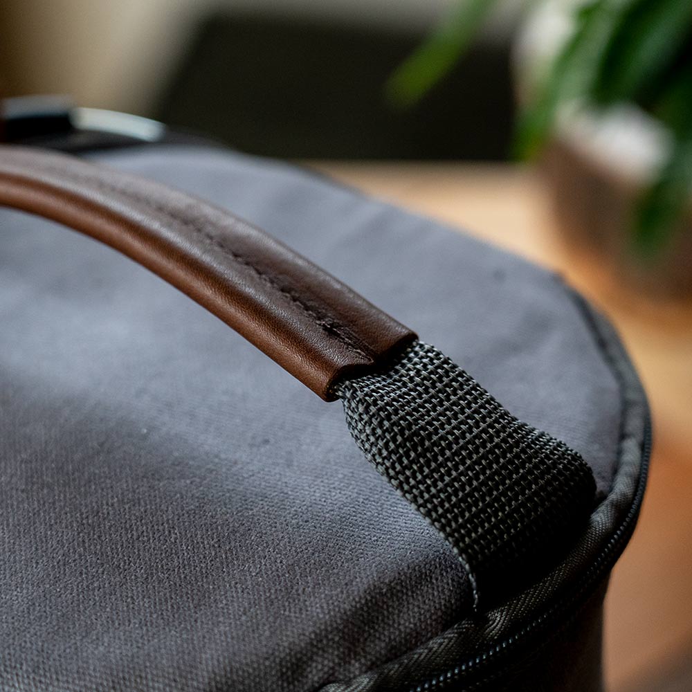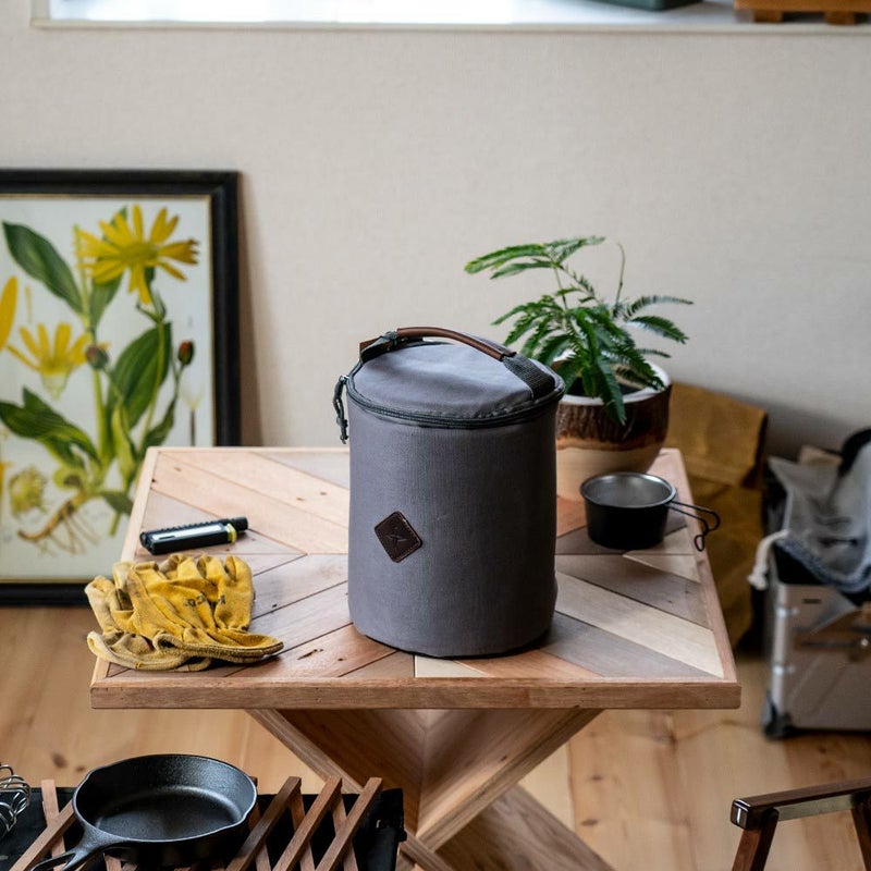 本体生地に使われているワックスコットン素材は、水をはじき、耐久性と軽量性を備えているため、ツールを保護するのに理想的な生地です。 摩耗や経年変化を楽しむことができて、アウトドアギアの収納に最適。地面に触れる底面は丈夫なポリウレタン生地を使用しています。