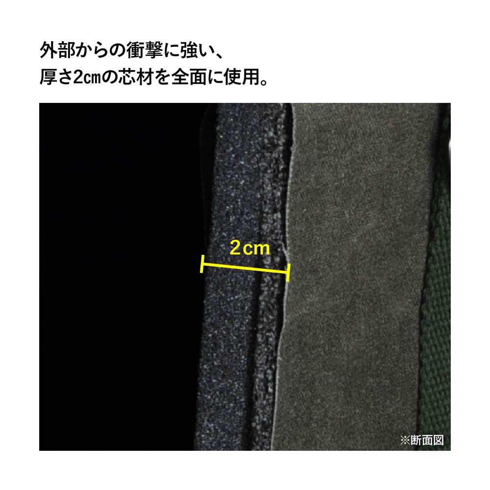 ・厚み約2cmのスポンジを芯材として全面に使用し、外部からの衝撃に強い構造。