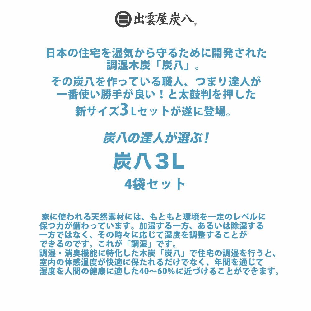 他の画像を見る 【出雲屋炭八 正規販売認定店】 マンション、戸建て、アパートの湿気 除湿対策に最適です。 防虫 除湿 ダニ 玄関 除湿 乾燥 出雲屋炭八|炭八 室内用大袋 12L 販売価格 ¥ 9,504 税込 カートに入れる お気に入りに登録する