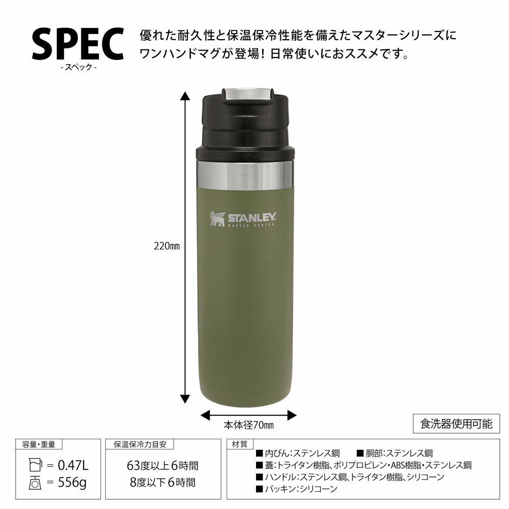 他の画像を見る 一生ものの品質 STANLEY スタンレー STANLEY マスター真空ワンハンドマグ 0.47L 水筒 マイボトル スタンレーボトル マスターシリーズ 販売価格 ¥ 9,020 税込 在庫切れ 詳細を見る お気に入りに登録する